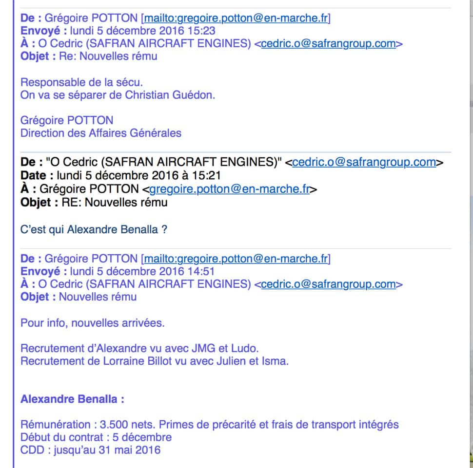 En quoi est-ce un sujet de fierté, pour un Président français, d’avoir embauché un garde du corps? Le niveau du Premier magistrat de France est devenu celui d’un recruteur de voyous? Car il est vrai que Benalla avait un parcours différent: il était violent de façon gratuite. Gilles de Laclause, ancien gérant de l’immeuble abritant les locaux du mouvement En Marche d’Emmanuel Macron, affirme, en novembre 2016, avoir eu deux altercations avec Benalla, qui avait été très agressif au téléphone. Il en avait averti des personnes du mouvement; on lui répondit que Benalla était bénévole auprès du mouvement. Malgré son arrogance et sa brutalité, il a été embauché dès le 5 décembre suivant, comme le prouve l’échange d’emails publié par Wikileaks et que nous reproduisons en fac-similé.