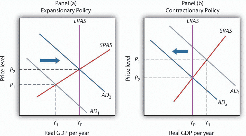 es politiques expansionnistes (dites d’accroitre l’expansion de l’économie) et les politiques contractionnelles (dites de ralentir l’expansion économique fonctionnent autant avec les politiques budgétaires dirigées par les divers gouvernements (des divers ministères des finances, et/ou de l’économie) qu’avec les politiques monétaires (des banques centrales). Au Liban, comme mondialement, elles ont pour but de contrôler l’apport de l’argent dans le marchés («dits : money supply»). Voyez que les courbes esquissant comment l’on représente la relation des politiques budgétaires expansionnistes et contractionnelles dans le court terme par rapport au long terme. Dans la Figure 2, la courbe LRAS veut lire «Long-Run Aggegate Supply», et le SRAS veut dire «Short-Run Aggregate Supply» (et pas le virus du SRAS, rassurez-vous). Quant aux courbes AD elles veulent dire «Aggregate Demand». Notez leurs rapports respectifs. La Figure 4 présente d’autres détails importants à travers ces courbes, avec deux cas (un au Liban, l’autre en Chine).