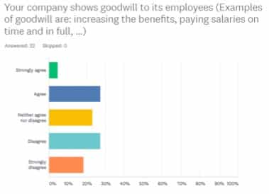 Ici nous présentons la suite des recherches effectuées de la même recherche. Donc, la figure 1 présente les résultats de la sixième question. Les avis sont pour la plupart partagés entres les avis non-favorables et favorables, donc montrant des avis partagés sur « Votre entreprise fait preuve de bonne volonté envers ses employés ». En dernière position, les sans avis. (voir: http://blog.blominvet.com). Notez que les exemples de bonne volonté sont: l’augmentation des bonus, et les primes, ou le paiement des salaires à temps et n heure, et en sa totalité, pour ne citer que certains exemples. Ceci clairement divise la force ouvrière libanaise, ou la masse salariale, car cela indique que les secteurs affectés par la crise auront tendance à licencier ses employés en masse, ou à réduire les couts, et les sociétés qui tiennent le coup font des efforts pour booster le moral des employés. (voir: http://blog.blominvet.com).