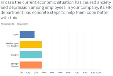 Selon la figure 2, nous avons une nette majorité d’avis non-favorables pour les réponses collectées pour la question 7. Ensuite viennent les sans avis et en dernière position, les avis favorables. En d’autres termes, la clause « Au cas où la situation économique actuelle aurait provoqué de l’anxiété et de la dépression chez les employés de votre entreprise, la GRH a adopté des mesures concrètes pour les aider à mieux faire face à ça » s’avère inexacte. (voir: http://blog.blominvet.com).