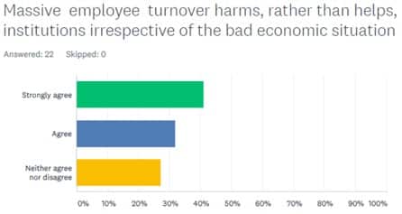L’augmentation des licenciements massifs et la chute des chiffres d’affaires des institutions les plus touchées par la crise financière de 2019, (et par la crise mondiale de la pandémie du Covid 19) normalement devraient gravement entraver la motivation de leurs masses salariales. Tout cela devrait aussi causer une chute vertigineuse de la productivité, des revenus et de la performance de ces organisations. (voir: https://www.project-syndicate.org/commentary/mapping-covid19-global-recession-worst-in-150-years-by-kenneth-rogoff-2020-04). Nous ne montrons pas les résultats la question 9, mais dans l’ensemble l’idée ci-dessus a été validée par les deux tiers des réponses. Ce qui veut dire, que les compagnies qui ne régularisent pas les licenciements d’effectifs, ou ne motivent pas leurs masses salariales elles-mêmes se vouent à l’échec. Ensuite sont talonnés de près les sans avis et les avis non favorables, culminant ensemble à près d’un tiers des réponses. (voir: http://blog.blominvet.com).