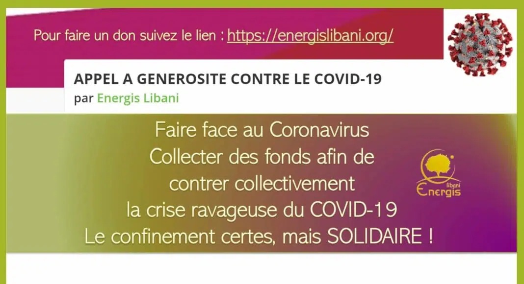 L’association Energis Libani lance une collecte de dons pour vaincre collectivement sur de multiples fronts : hôpitaux saturés, services publics au ralenti, chômage massif et surtout une armées de chercheurs, de médecins, d’infirmiers et de soignants en manque cruel d’équipements, des plus simples (masques gel,…) aux plus sophistiqués (ventilateurs et aujourd’hui déjà, on pointe le manque de médicaments en unités de réanimation). Rejoignez-la !