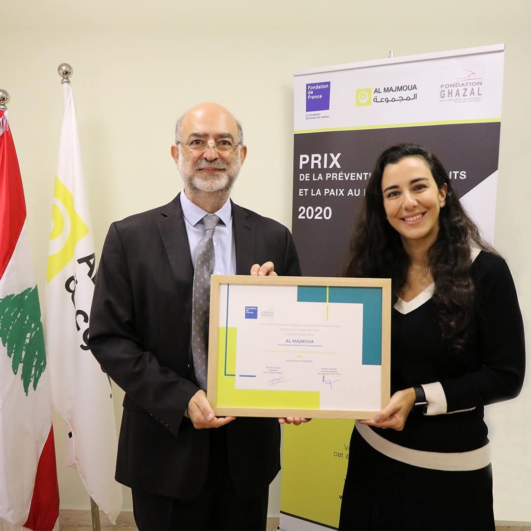Dans la lignée du travail de son Fondateur qui a exercé pendant plus de 35 ans comme conseil, formateur, médiateur, conférencier et auteur dans les domaines de la Négociation et la Gestion des conflits, la Fondation Ghazal décerne tous les ans le Prix de la Prévention des Conflits et la Paix au Liban. Celui-ci apporte non seulement une reconnaissance et une visibilité, mais il est doté aussi d’une subvention financière de 20.000 US Dollars, tout en réitérant que cette année la somme s’est élevée exceptionnellement à 50.000 US Dollars, répartis à égalité entre la Fondation Ghazal et la Fondation de France.