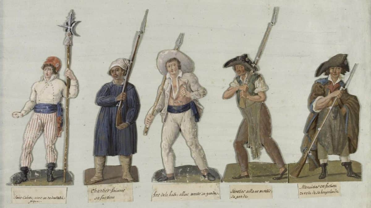 En France toujours durant la Révolution Française, des symboles vestimentaires sont également apparus avec le bonnet Phrygien rouge, en souvenir des esclaves romains affranchis accompagné d’une cocarde et les sans-culottes – pantalons longs à rayures – appelés ainsi par mépris de cette classe sociale et qui s’oppose à l’Aristocratie. Ces derniers portaient alors des culottes désignant à l’époque les pantalons courts complétés par l’usage de bas.