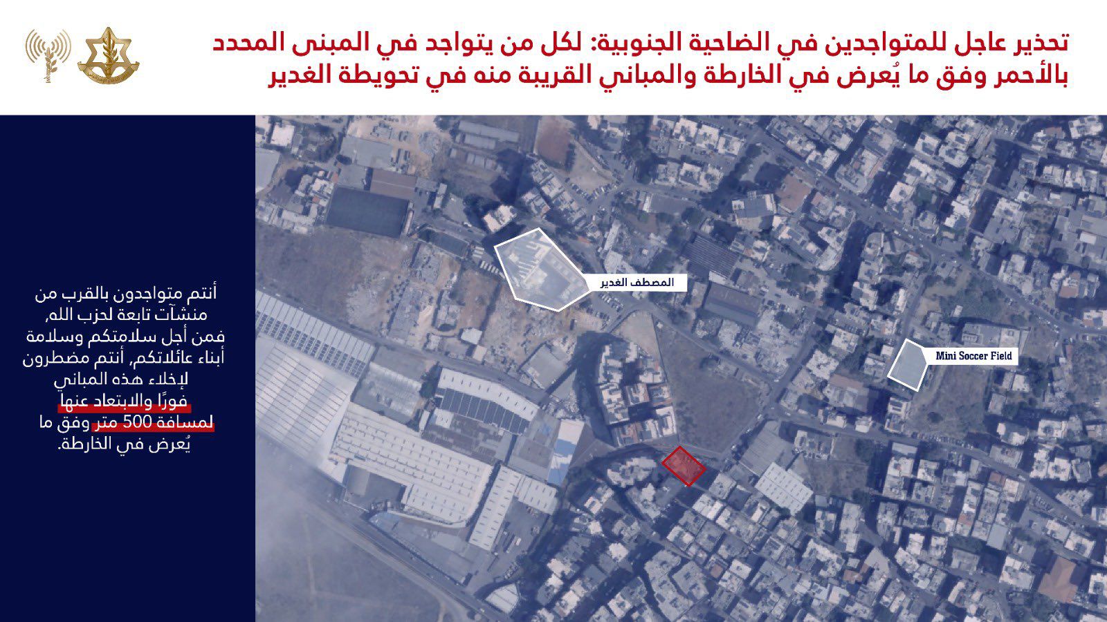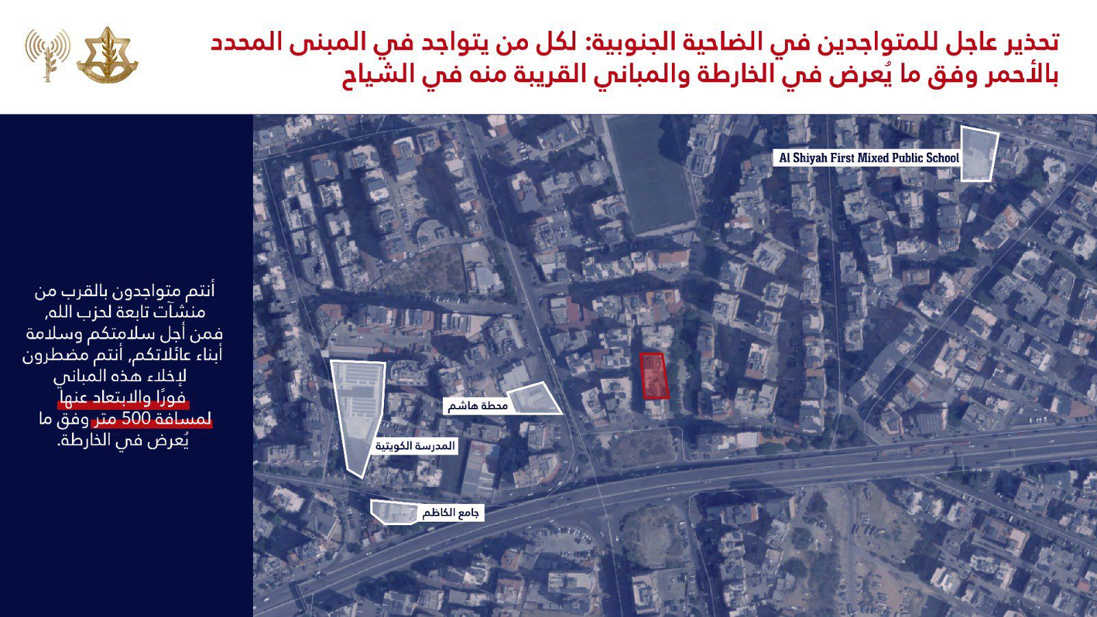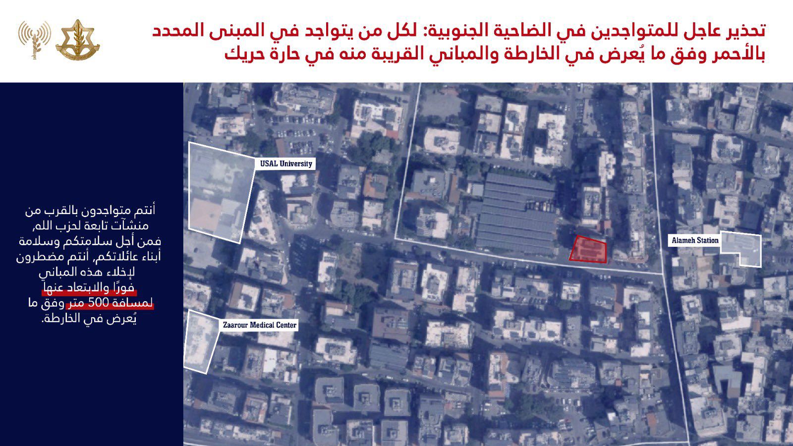 « Vous vous trouvez près des installations du Hezbollah. Pour la sécurité de vos familles et de vos enfants, vous devez évacuer immédiatement ces bâtiments et vous éloigner d’au moins 500 mètres, conformément aux cartes jointes. »