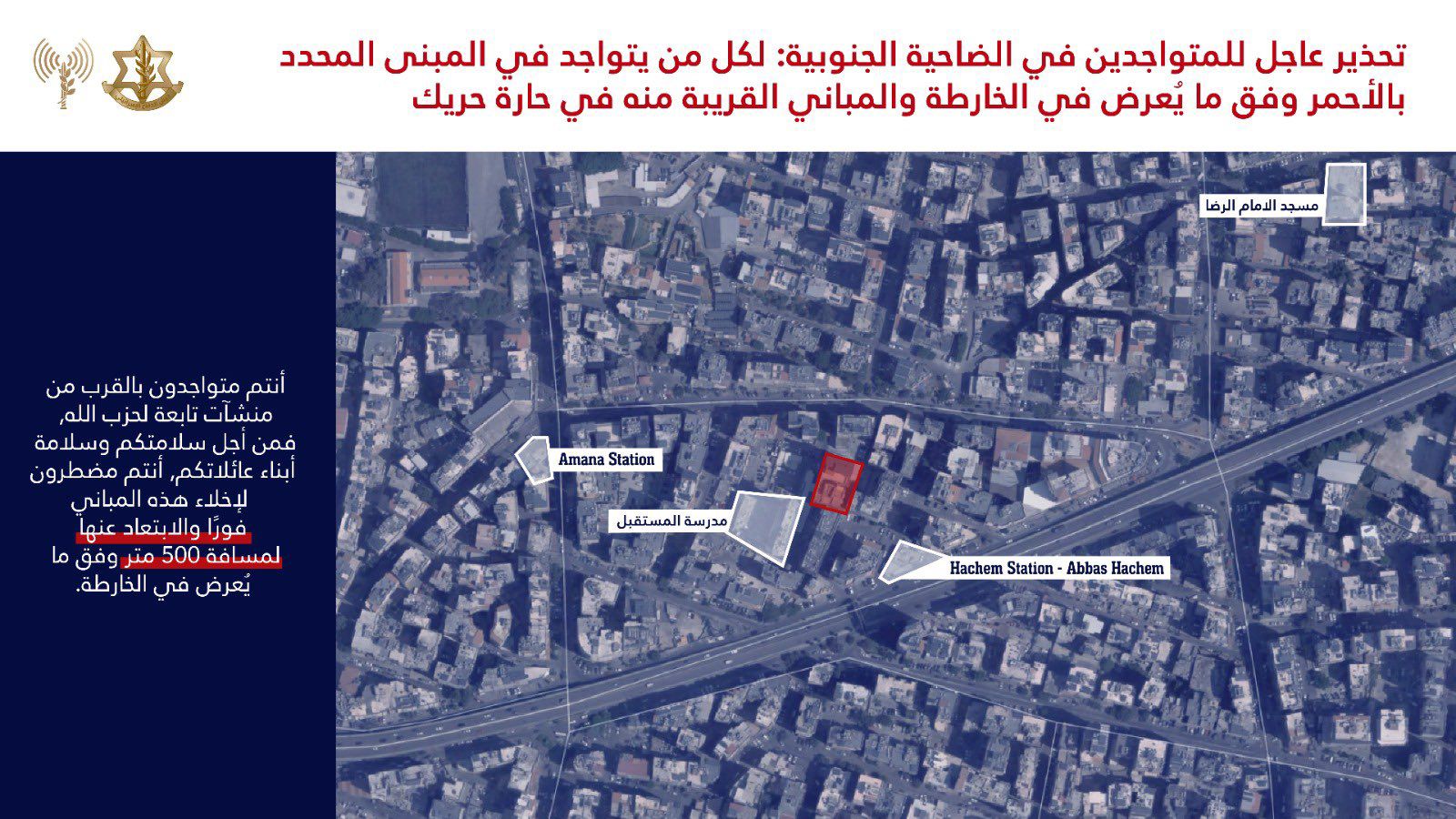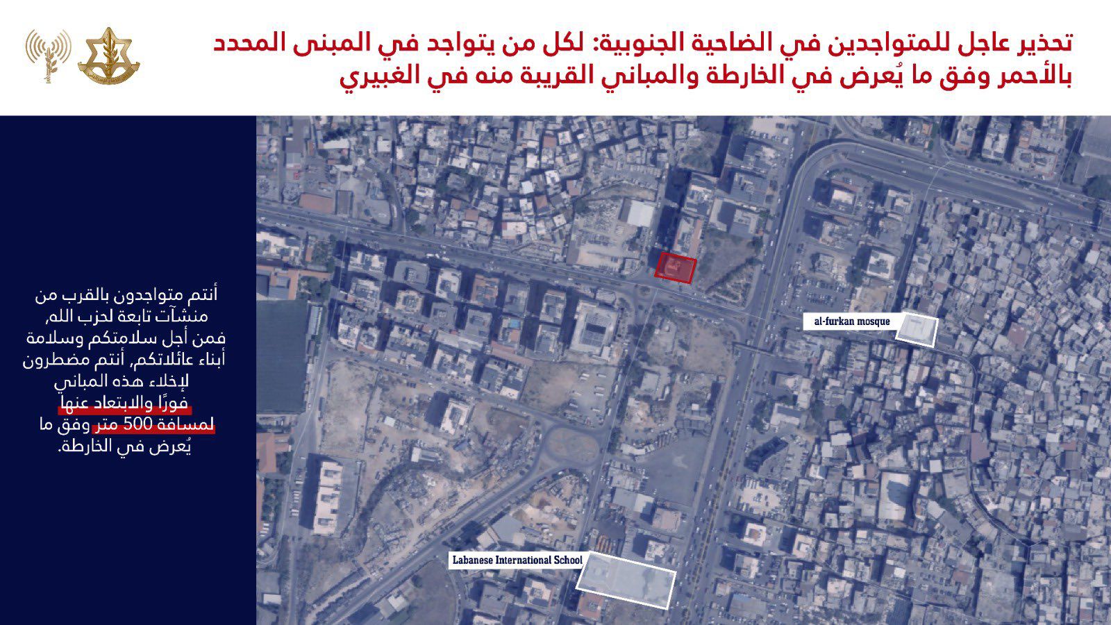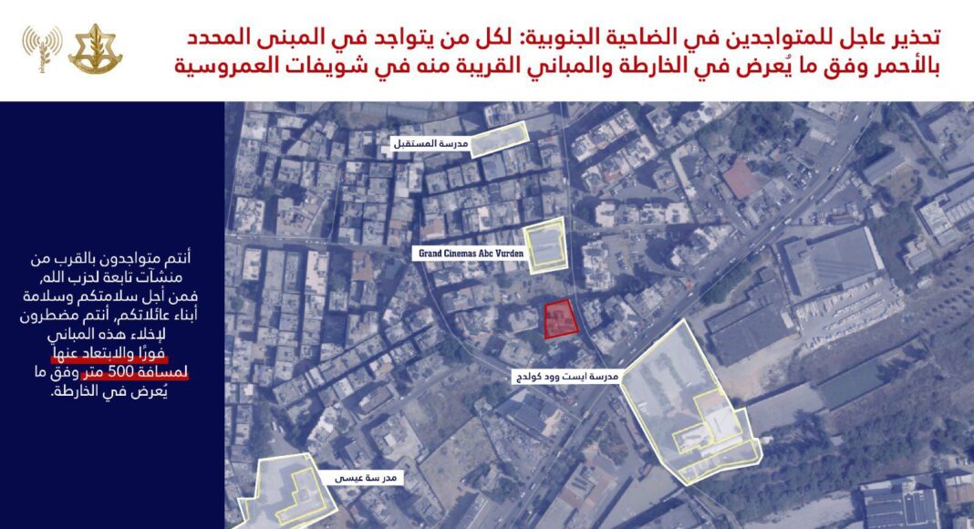 Les publications israéliennes comportent des cartes détaillées montrant les localisations exactes des bâtiments supposés abriter des infrastructures du Hezbollah. L’armée israélienne, dans ces avertissements, semble se préparer à des frappes ciblées, menaçant ainsi la sécurité des résidents qui ne respecteraient pas les consignes d’évacuation.