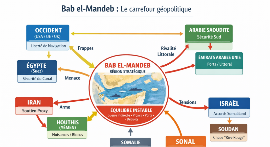 Bab el-Mandeb est moins un lieu à “occuper” qu’un lieu à rendre coûteux pour l’autre : les Houthis cherchent le coût maximal pour une dépense minimale ; les grandes puissances cherchent à réduire ce coût par présence navale et bases arrière (souvent Djibouti) ; les États du Golfe et Israël cherchent des rives, des ports et des reconnaissances (Somaliland) pour verrouiller la zone ; l’Égypte veut empêcher que ce coût devienne structurel et se fixe contre Suez.