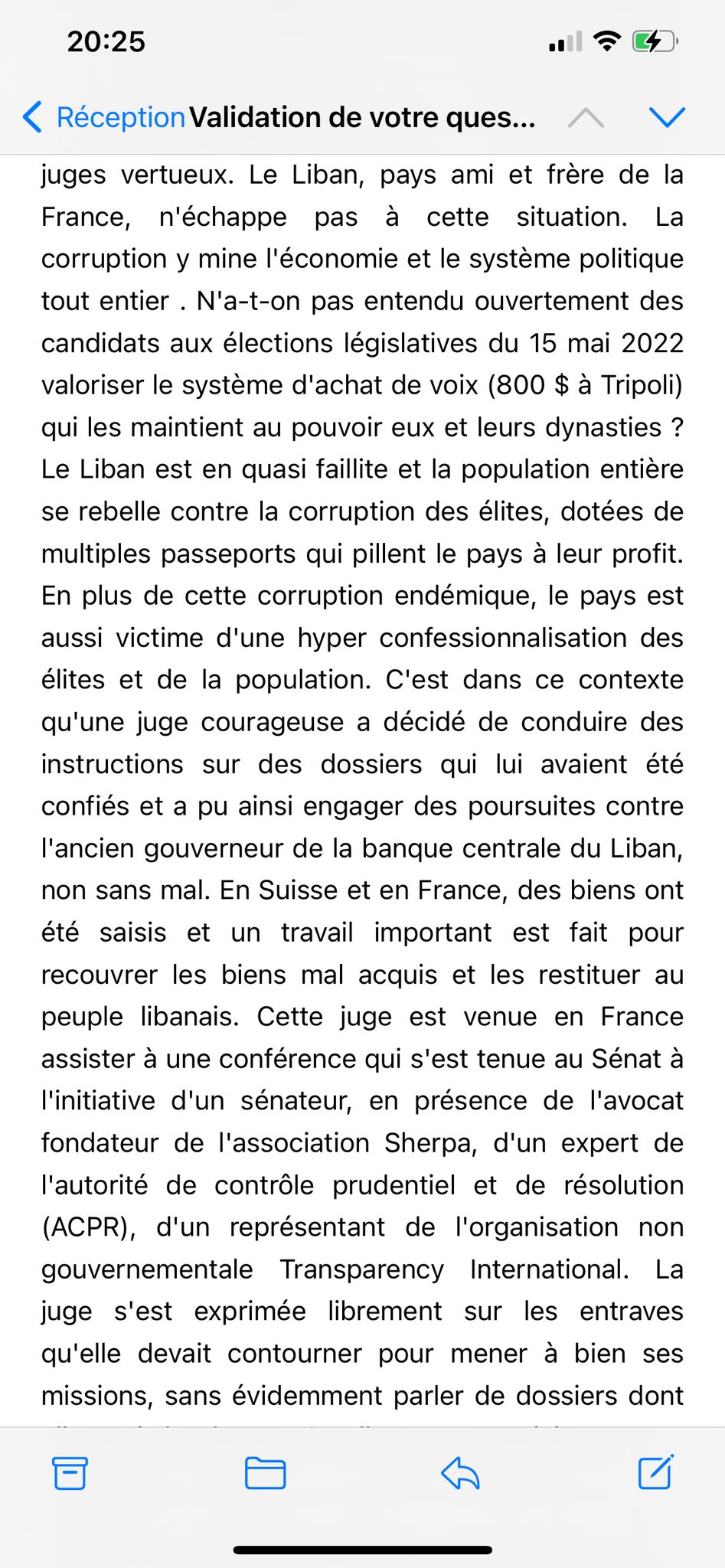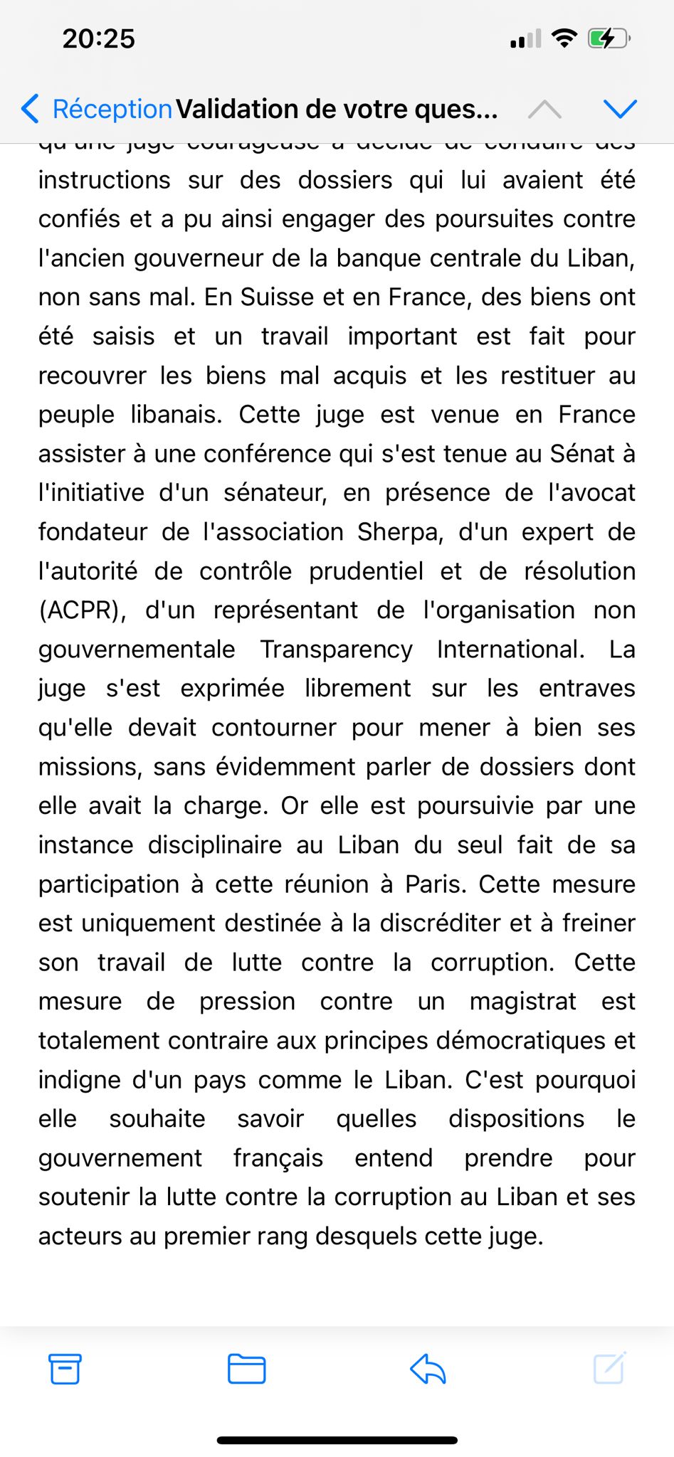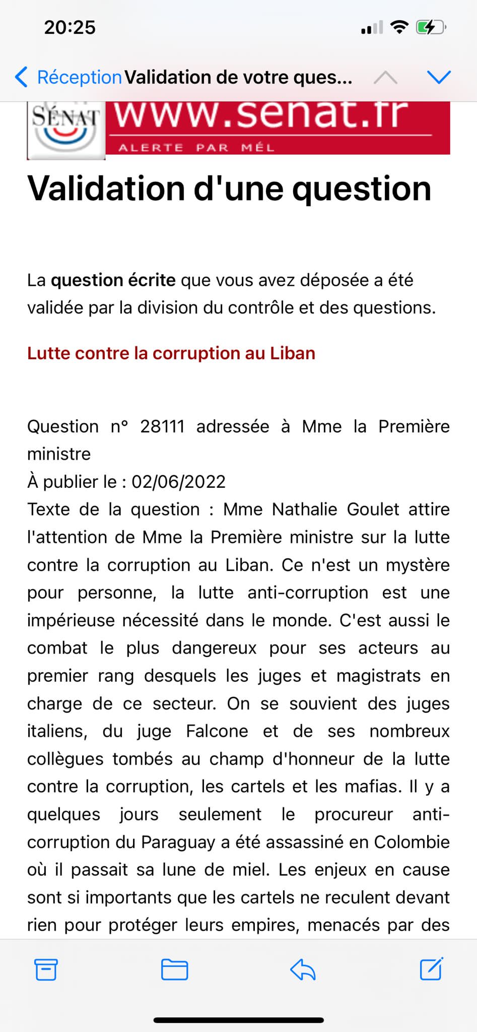 La procureure du Mont-Liban a également publié sur Twitter la lettre de la sénatrice française Nathalie Goulet à la Première ministre française Élisabeth Borne :