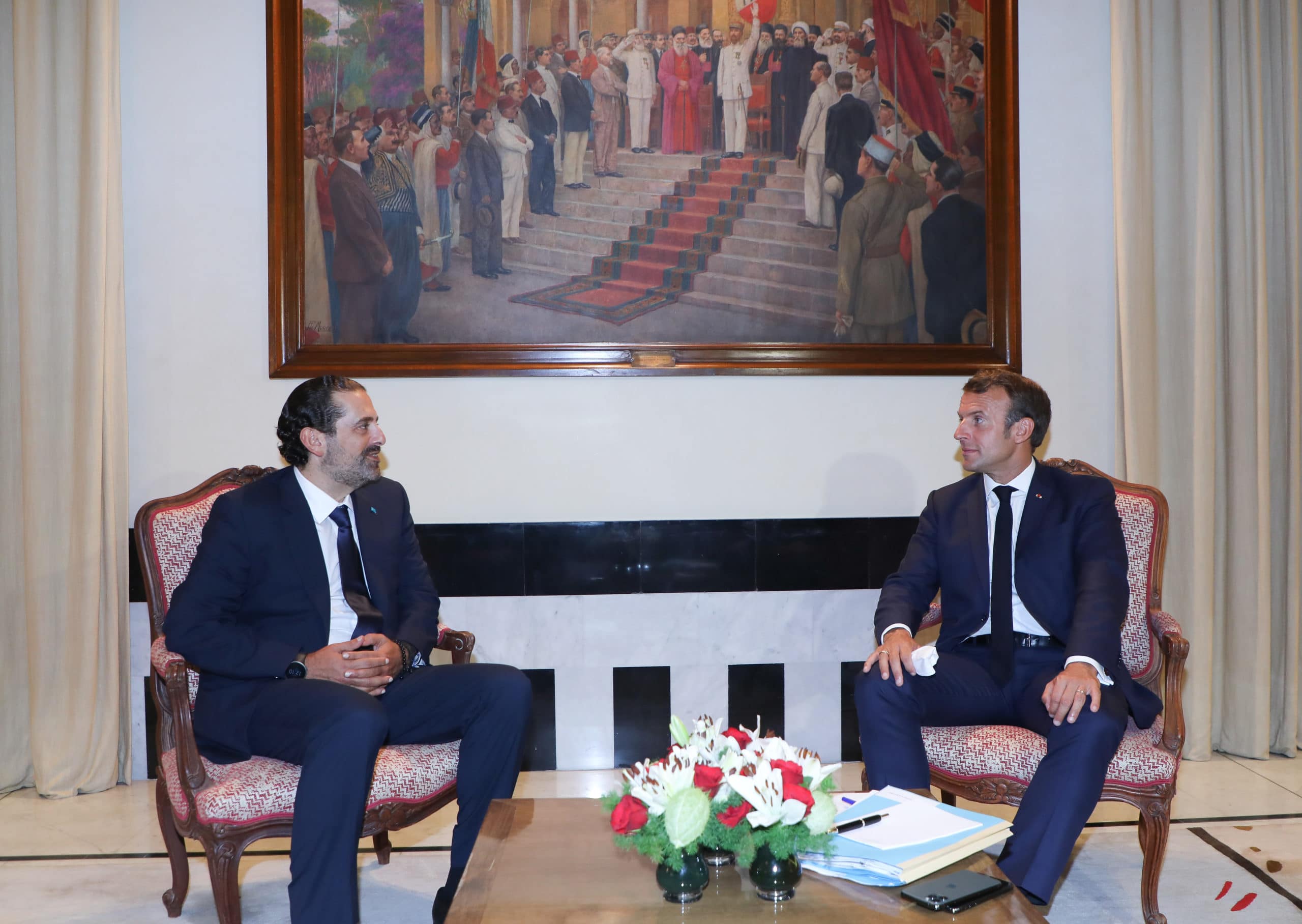 Emmanuel Macron s’est rendu auprès de l’ancien Ministre Saad Hariri encore dans la soirée du 31 août, avec lequel il a évoqué l’actualité locale sous un tableau représentant la proclamation de l’état du Grand Liban.