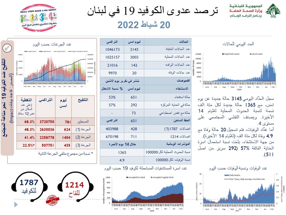 Depuis, le nombre de nouveaux cas au Liban a dépassé le seuil du million, indique le ministère de la santé, alors qu’on s’approche des 10 000 morts induits par les complications de la maladie. 9 970 personnes sont ainsi décédées en 2 ans, soit une moyenne de 13 personnes par jour en 2 ans et une pointe qui dépassé 100 personnes décédées quotidiennement en 2021 avant de se stabiliser aujourd’hui, un bilan élevé tout de même un pays comme le Liban.
