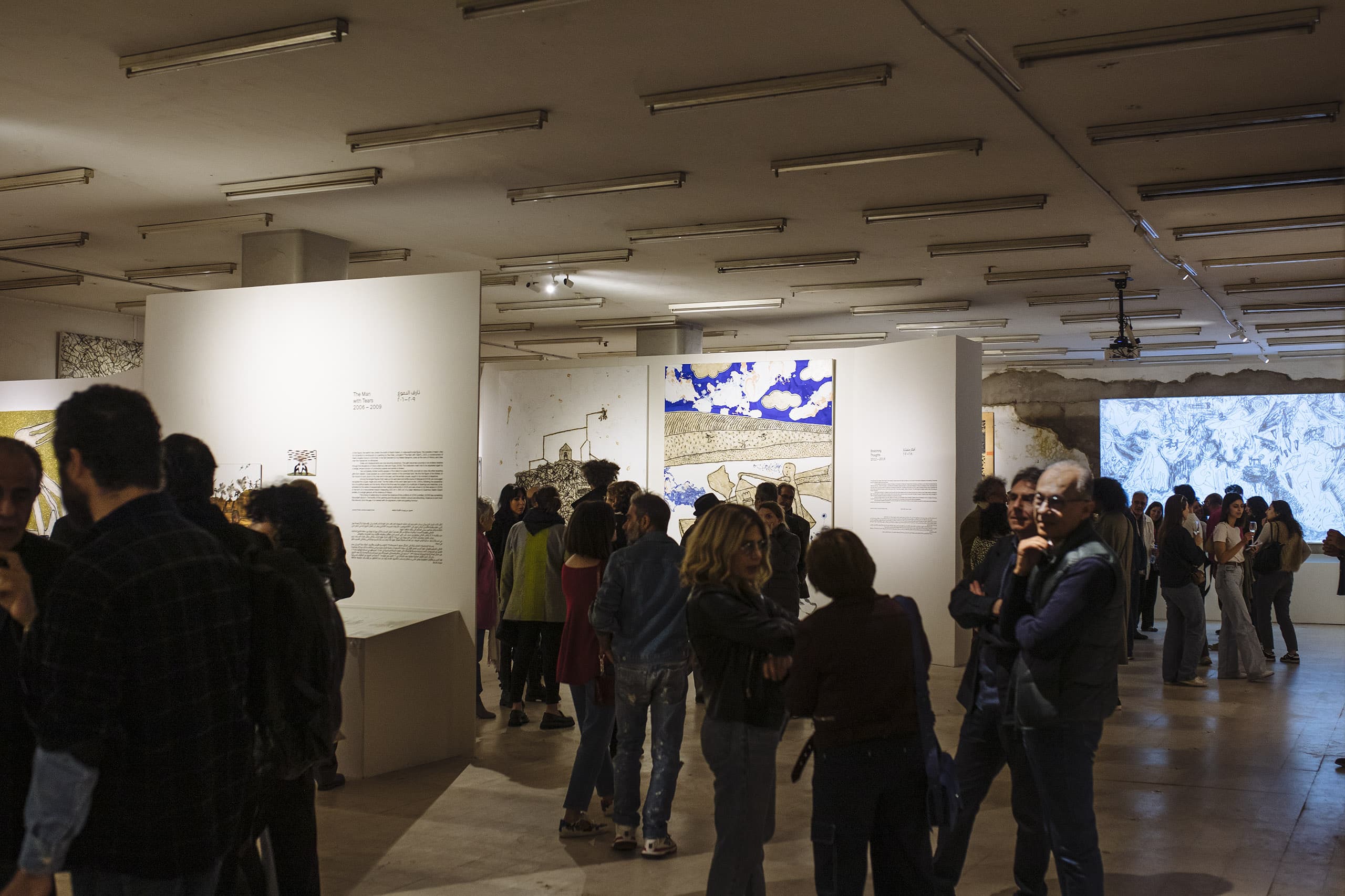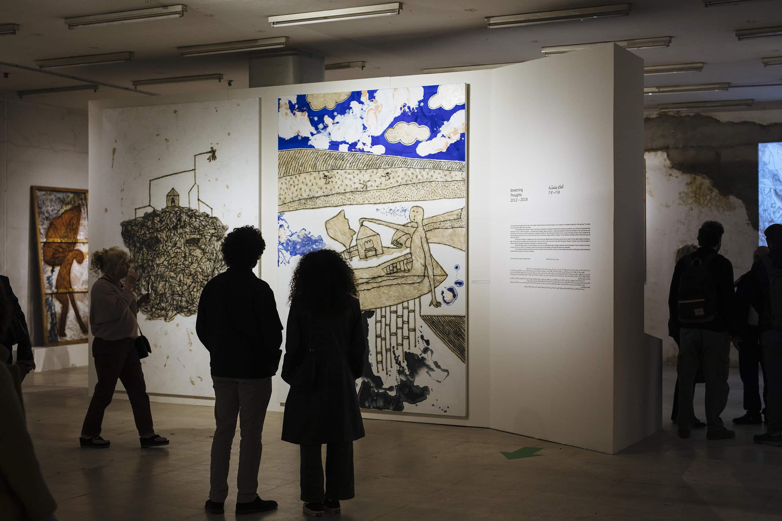 Comme un grand registre du temps présent, l’œuvre de Nadim Karam enregistre son temps, en particulier celui des 30 dernières années de vécu et d’Histoire : la guerre de 2006, le déplacement des populations du Moyen-Orient, le contexte de confinement, l’explosion catastrophique du port de Beyrouth y occupent une place certaine. Le grand panneau en triptyque intitulé Massacre (Matériaux mixtes sur toile, 200 x 360 cm, 2009) y a une importance centrale. Violence et poids de l’Histoire, ruines, enracinement et exil sont donc les questions qui traversent cette œuvre polymorphe, tant par les supports et formats qu’elle sollicite, que par les médiums, les matières et les techniques dans et à travers lesquels elle prend forme, que les caractères et les récits qu’elle génère. C’est cette fluidité des figures qui migrent en un flux continu de ses carnets de dessins jusqu’à l’espace public, en passant par de multiples avatars, que cette exposition en 5 sections retraçant le parcours de Karam invite aussi à considérer.
