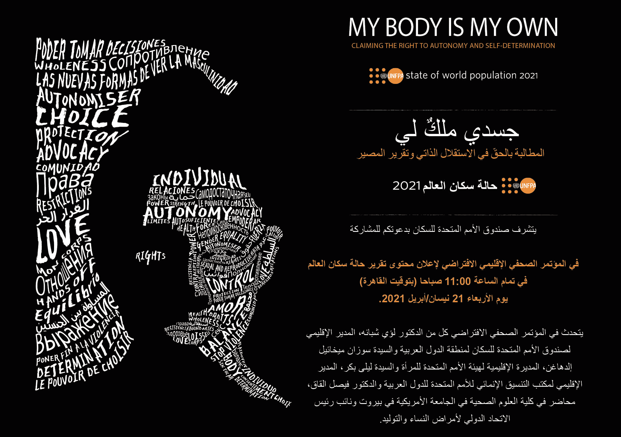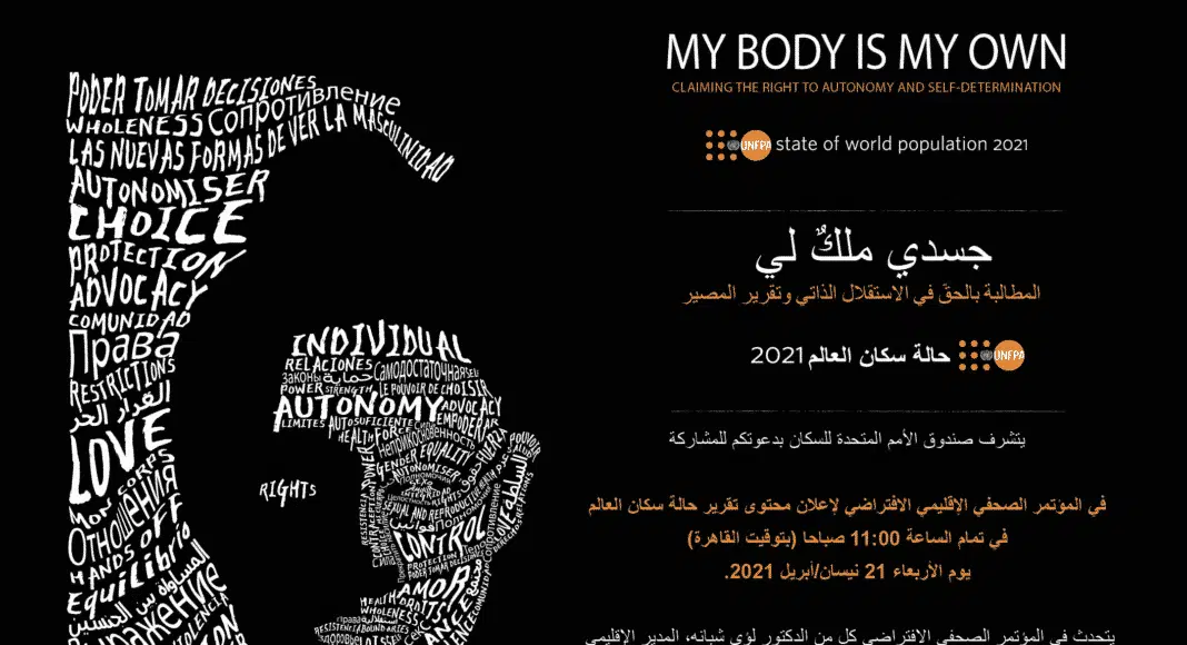 The United Nations Development Fund (UNFPA) is pleased to invite you to attend the regional virtual press conference to launch the State of World Population 2021 on Wednesday 21 April at 11:00 am (Cairo time).