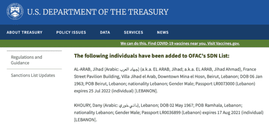 Jamil Sayyed, Jihad Al Arab, Dany Khoury sanctionnés par les Etats-Unis