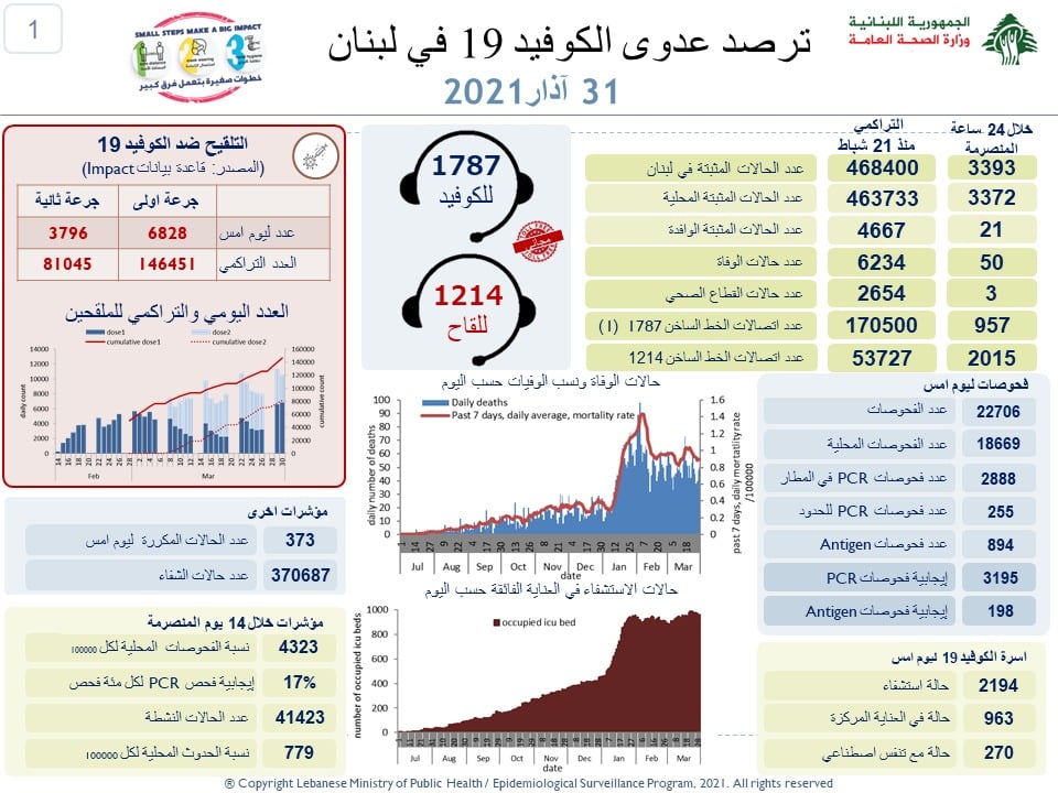 Parallèlement, le Liban est également touché par le coronavirus. Les mesures prises par les autorités se sont révélées être aujourd’hui insuffisantes et le pays des cèdres risque de perdre le contrôle de l’épidémie, avec une augmentation quasi incontrôlée du nombre de cas, notamment après l’explosion du port de Beyrouth. Désormais, les capacités hospitalières actuelles sont saturées depuis 2 semaines, amenant également à l’augmentation du nombre de décès depuis la fin du mois d’août.