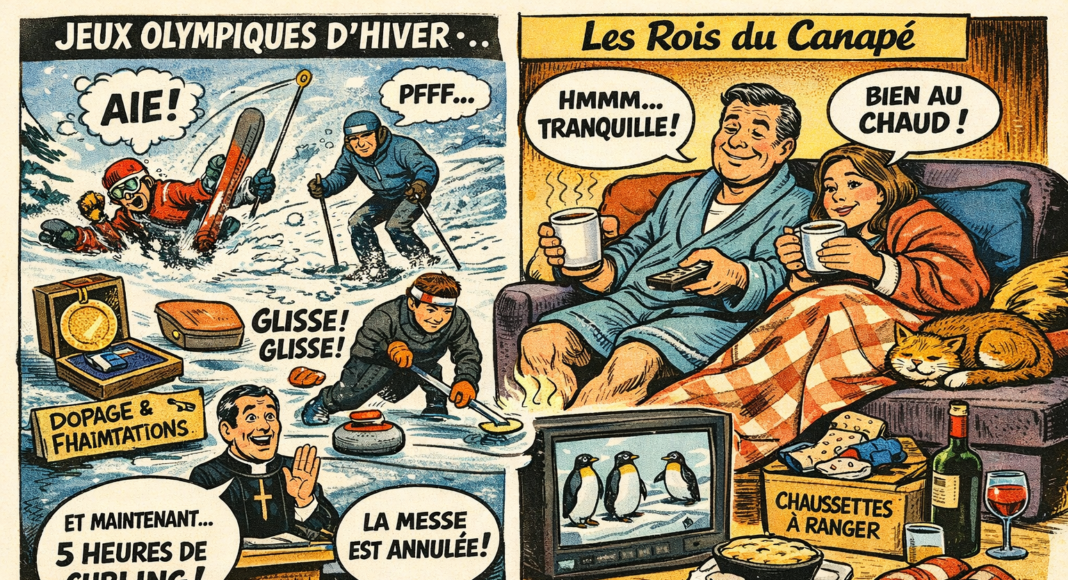 Mais le pire, c’est l’invasion de la télé ! Bye bye nos séries débiles avec des twists plus tordus qu’une piste de bobsleigh, nos docs sur les lions qui chassent sans pub, et même les réclames interminables qui nous laissent pisser tranquilles. Non, là c’est des heures de curling – ces balayeurs enragés qui frottent la glace comme si c’était vital. Et le pompon : même la messe du dimanche sur France 2, pouf, disparue à cause des JO ! Ok, elle était pas toujours top, avec des prêches qui endorment et des chants qui font saigner les oreilles, mais bon, on gagne quoi ? Au lieu d’un sermon sur la patience, on a des skieurs de fond qui rament à 2 km/h dans la tempête. Si le bon Dieu voulait du sport le dimanche matin, il aurait créé le foot sur glace.