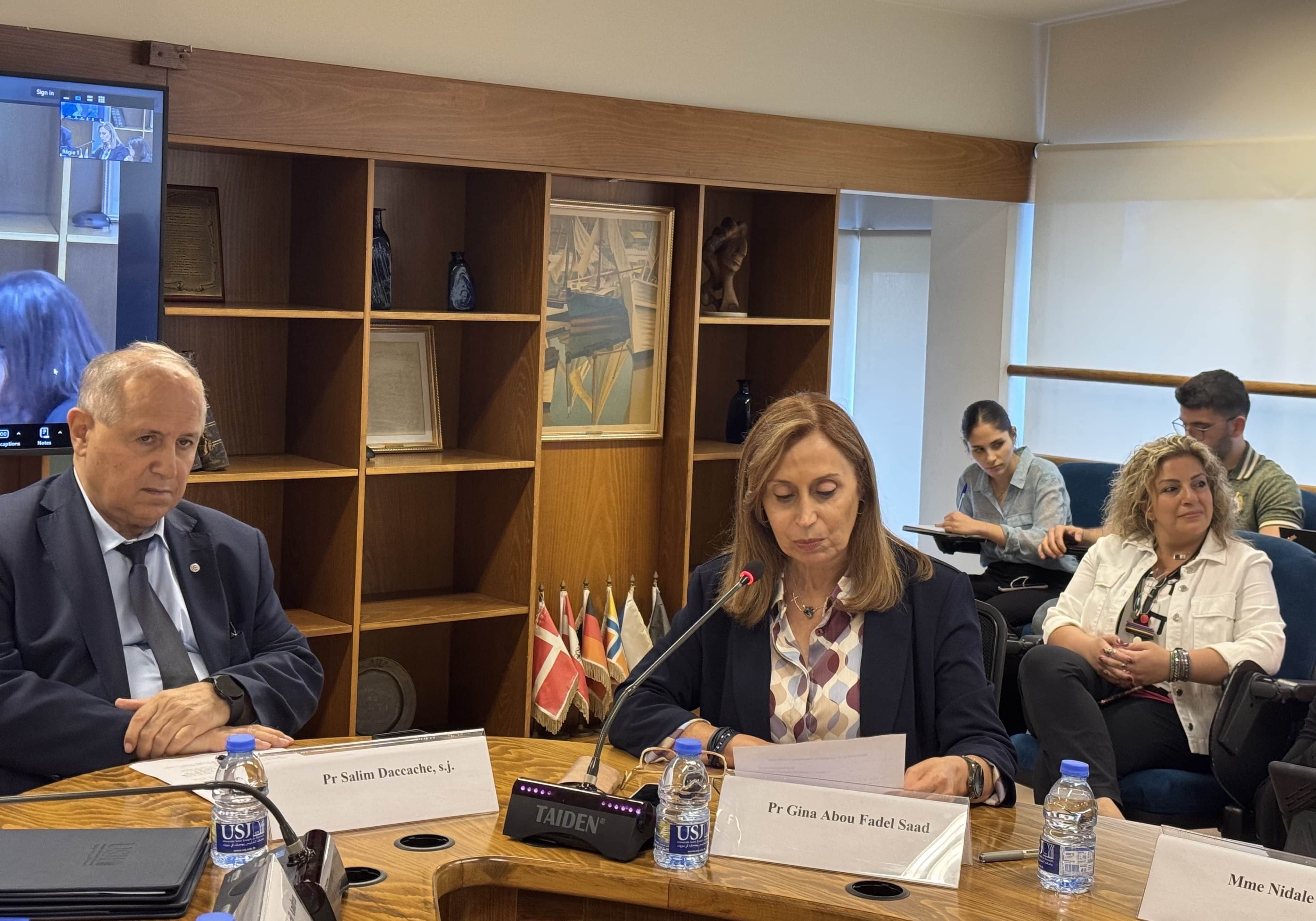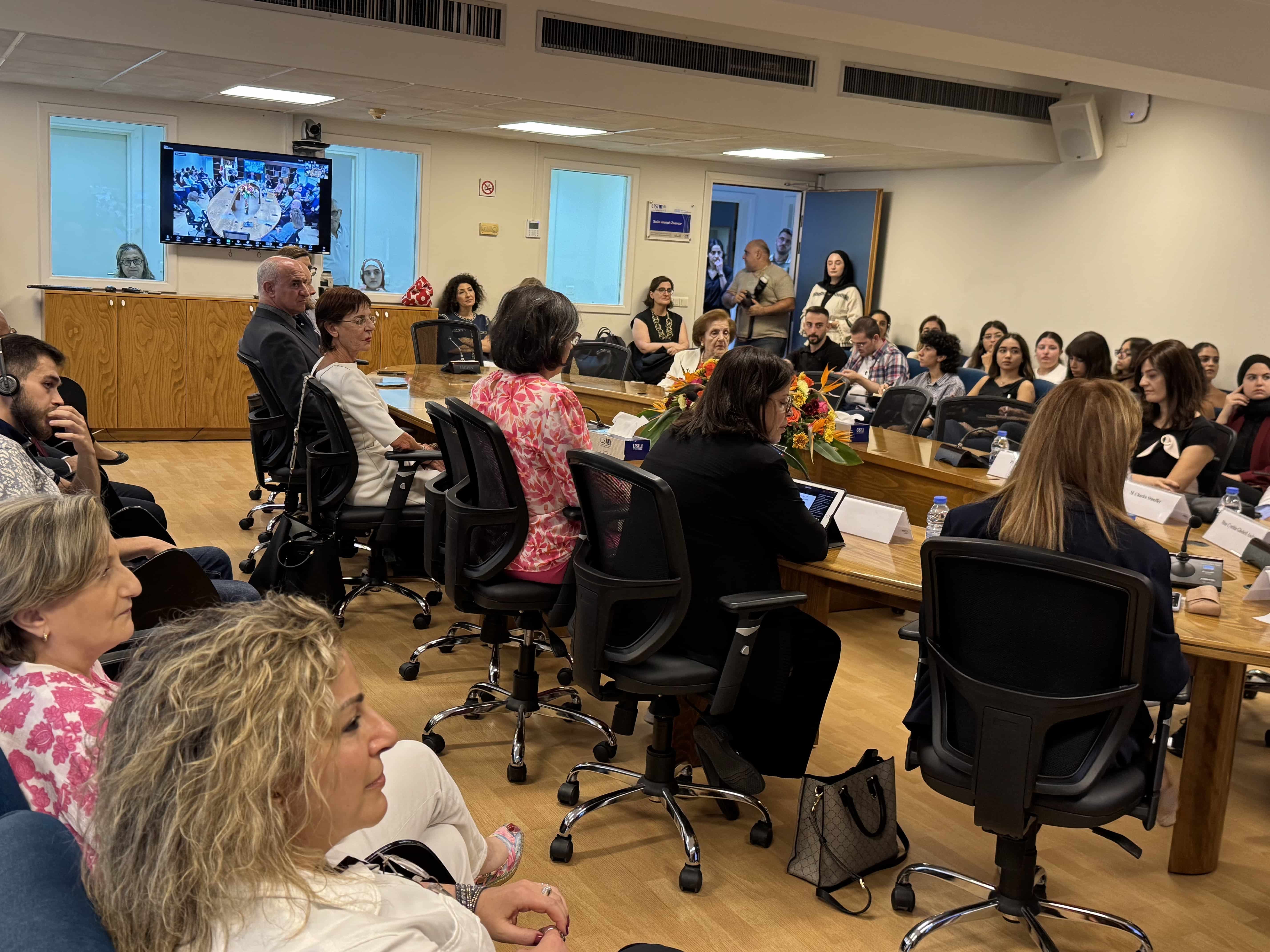 Les différentes institutions de l’USJ, spécialistes des langues, étaient présentes autour du recteur, le Révérend Père Salim Daccache, s.j., et des vice-recteurs, les PP. François Boëdec, s.j. et Salah Abou Jaoudé : le Pr Gina Abou Fadel Saad, doyen de la FdlT (Faculté de langues et de traduction), le Pr associé Mary Yazbeck, directrice de l’ETIB (École de traducteurs et d’interprètes de Beyrouth), le Pr May Hobeika Haddad, directrice du CERTTAL (Centre de recherche en traductologie, en terminologie arabe et en langues) et Mme Carole Nehmé, directrice du CREA (Centre de recherches et d’études arabes).