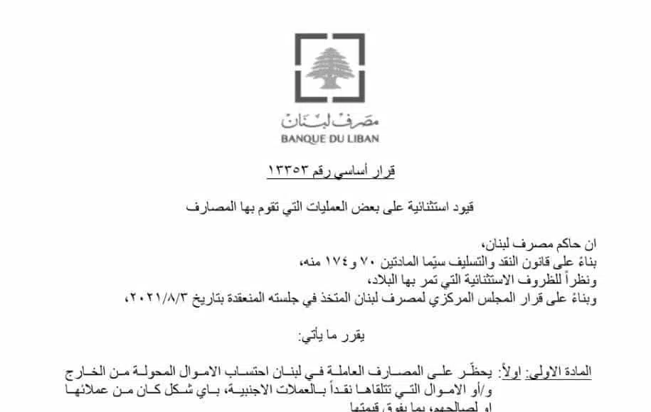 La Banque du Liban a publié une nouvelle circulaire, la 159, permettant aux banques libanaises de donner des livres libanaises sur base du taux de sa plateforme électronique Sayrafa au lieu de devises étrangères concernant les comptes dit « fresh money » qui étaient pourtant jusqu’à présents protégés de ce type de pratiques.