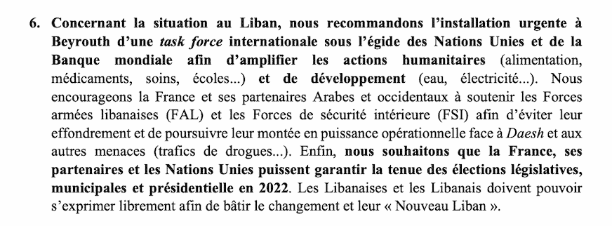 Par ailleurs, une taskforce internationale humanitaire sous l’égide des Nations-Unies et de la Banque Mondiale est recommandée pour répondre aux urgences actuelles de la population face aux pénuries de médicaments et permettre le développement et l’accès à l’eau et à l’électricité.