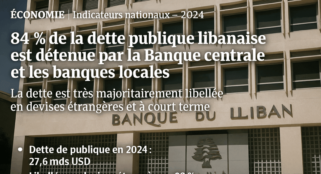 En 2024, la dette publique du Liban, estimée à 2 472 330 milliards de livres libanaises, soit environ 27,6 milliards de dollars américains au taux officiel de 89 500 LL/USD, repose presque exclusivement sur des créanciers domestiques et en majorité sur des engagements en devises. Cette dette est répartie à hauteur de 52 % au profit de la Banque du Liban (BdL), 32 % au profit des banques commerciales locales, 12 % au profit d’autres créanciers internes, et seulement 4 % entre les mains de créanciers étrangers ou d’institutions multilatérales. Cette structure, extrêmement concentrée, reflète une dépendance totale à l’endogamie financière, dans un contexte d’isolement du Liban vis-à-vis des marchés de capitaux internationaux.
