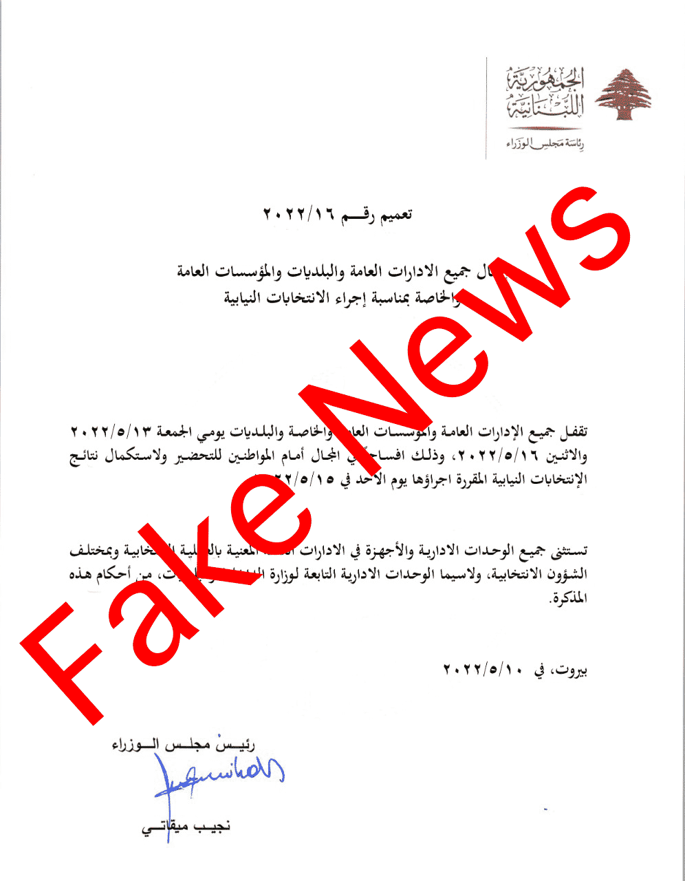 La Direction générale de la Présidence du Conseil des ministres a démenti, par un communiqué, « la publication de tout mémorandum par le Premier ministre concernant la prétendue fermeture des administrations et institutions publiques ce vendredi et ce lundi à l’occasion des élections législatives ».