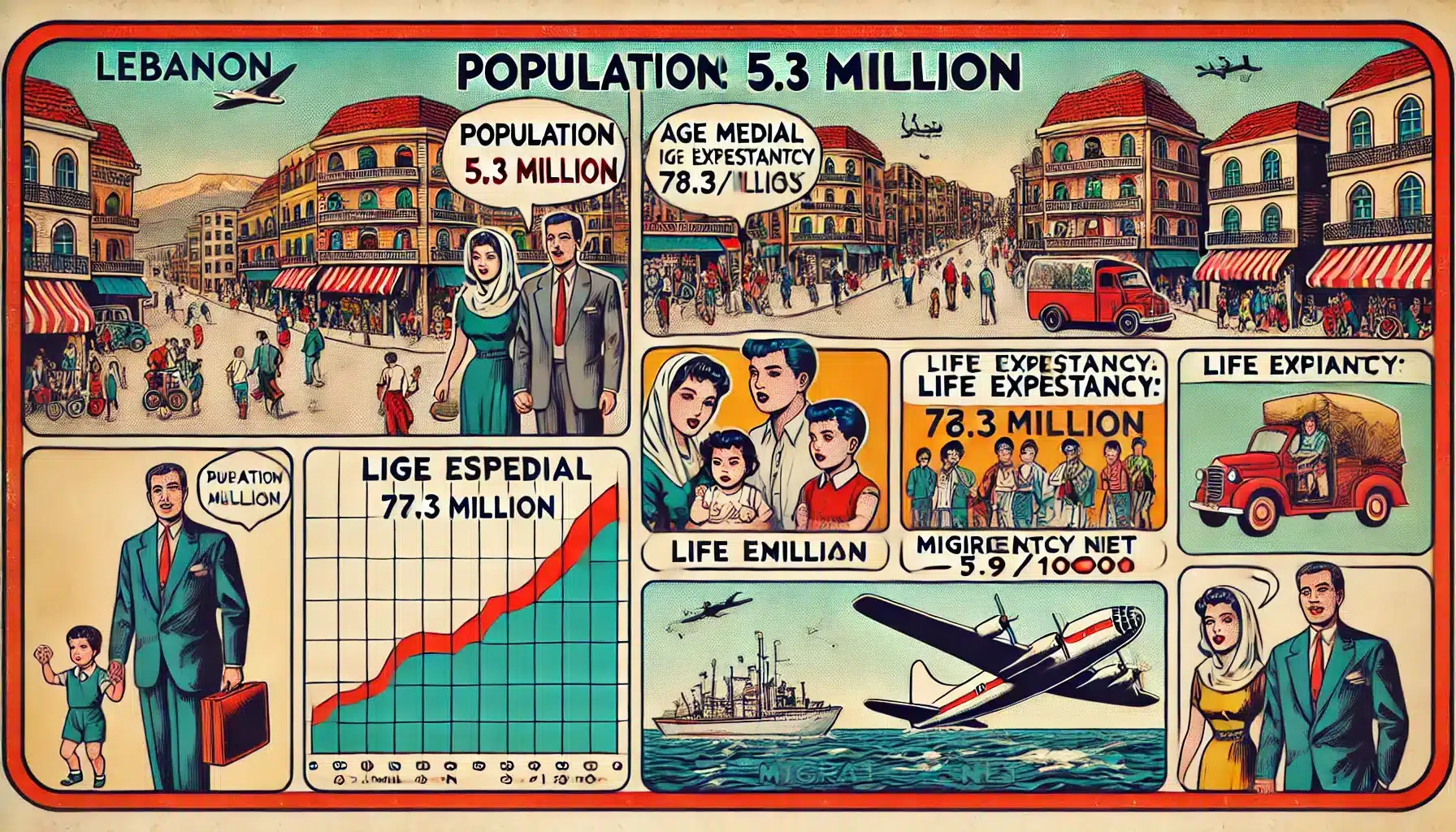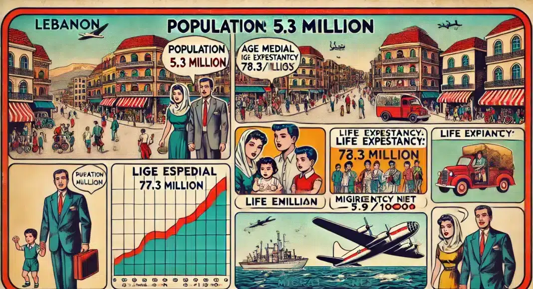 En 2023, la population du Liban a atteint 5,8 millions avec une espérance de vie moyenne de 77,8 ans. Les femmes représentent 51,4 % de la population. La mortalité infantile est passée à 15,7 décès pour 1 000 naissances vivantes, tandis que le taux de migration nette a atteint -5,9 pour 1 000 habitants.