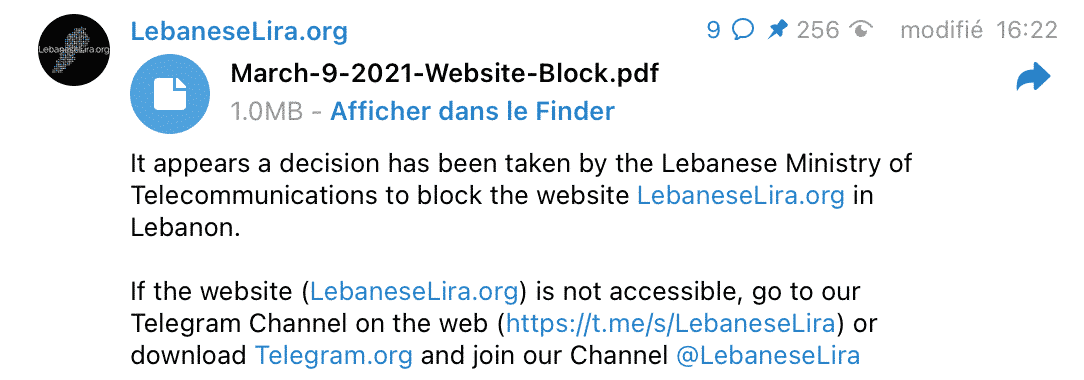 L’accès au site LebaneseLira.Org sera prochainement fermé sur décision judiciaire, cela sur demande du ministère des télécommunications. Cette décision était attendue suite à la réunion extraordinaire qui s’est tenue ce lundi au Palais Présidentiel de Baabda et demandant aux agences de sécurité et aux ministères concernés d’interdire l’accès aux plateformes et application publiant le cours continue de la livre libanaise face au dollar au marché noir suite à des accusations de manipulation des taux de change.