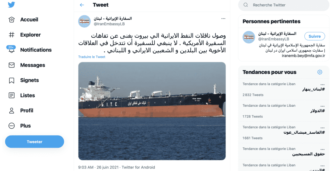 Le tweet, accompagné par la photographie d’un tanker iranien, n’annonce cependant pas l’arrivée d’un navire au Liban. Des sources du ministère de l’énergie et des ressources hydrauliques ont ainsi indiqué qu’aucune autorisation en vue d’importer au Liban du carburant en provenance d’Iran n’a été demandée jusqu’à présent en dépit des propos du secrétaire général du Hezbollah, Sayyed Hassan Nasrallah qui annonçait que les préparatifs pour cela ont été effectués.