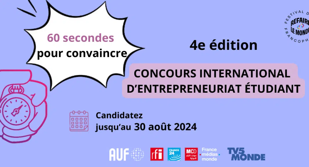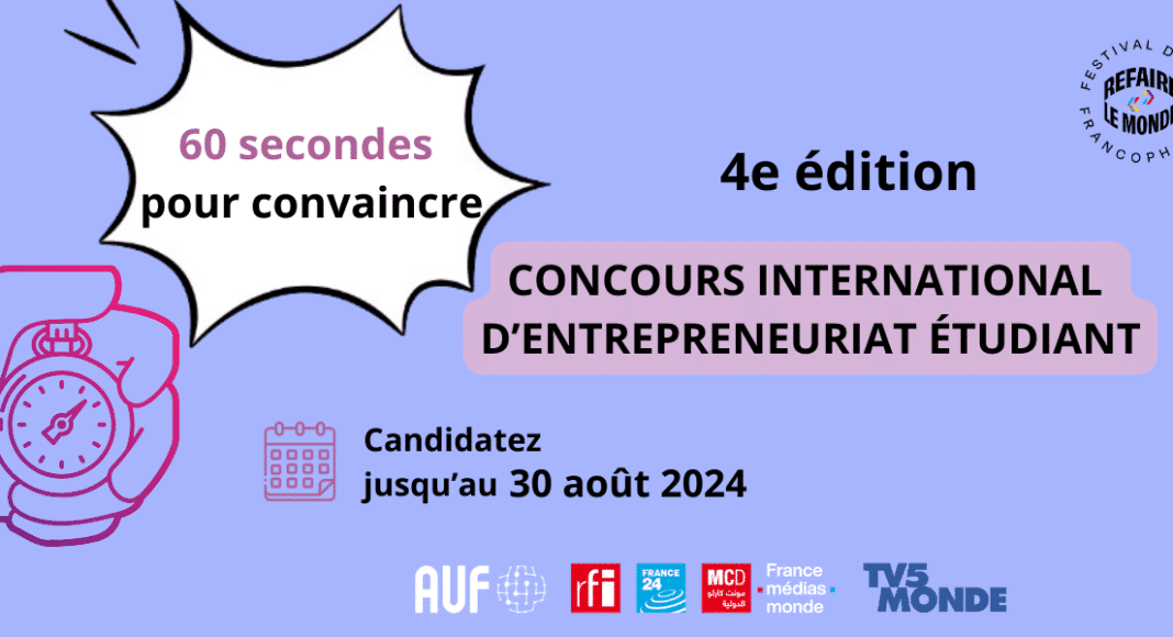 Beyrouth, le 23 juillet 2024 | L’Agence Universitaire de la Francophonie (AUF) lance, avec ses partenaires TV5MONDE et France Médias Monde (RFI, France 24, Monte Carlo Doualiya), la quatrième édition du concours international « 60 secondes pour convaincre ». Ouverte à tous les étudiants des établissements membres de l’AUF, cette compétition met en lumière leur créativité et leur capacité d’innovation. Elle s’inscrit également dans le cadre des efforts continus de l’AUF pour encourager le développement de la culture entrepreneuriale au sein de ses établissements membres.