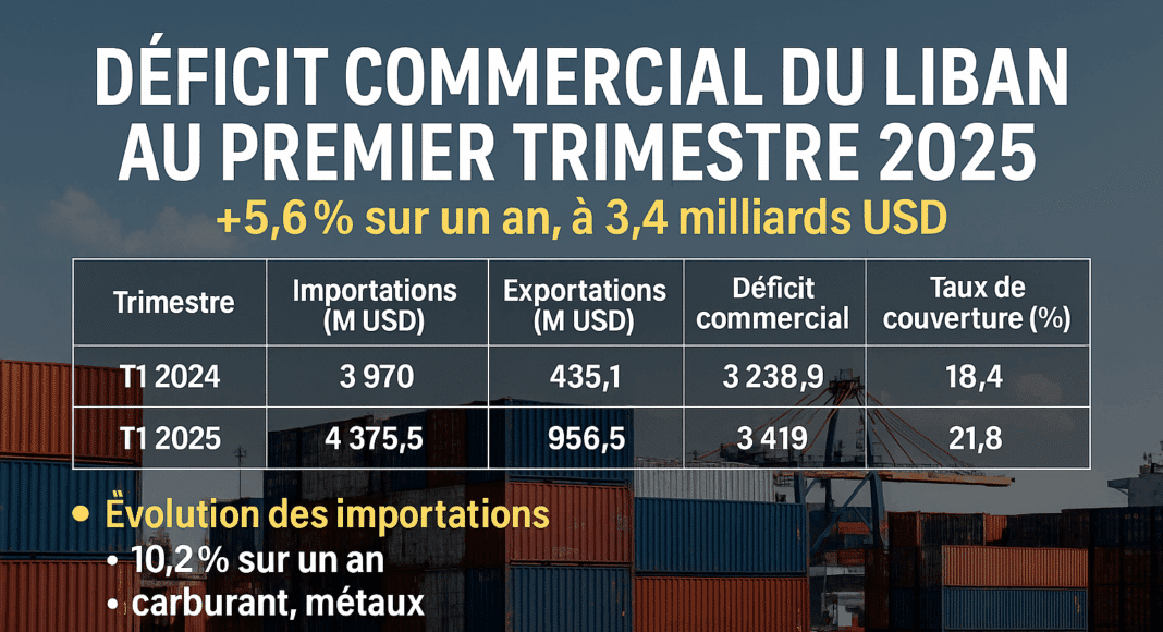 Les données publiées pour le premier trimestre 2025 montrent un déficit commercial de 3,4 milliards de dollars pour le Liban, en progression de 5,6 % par rapport à la même période en 2024. Les importations ont totalisé 4,38 milliards USD (+10,2 %), tandis que les exportations se sont établies à 956,5 millions USD (+30,8 %). Malgré cette progression remarquable des exportations, la hausse des importations en valeur absolue reste supérieure, creusant davantage le déficit commercial.