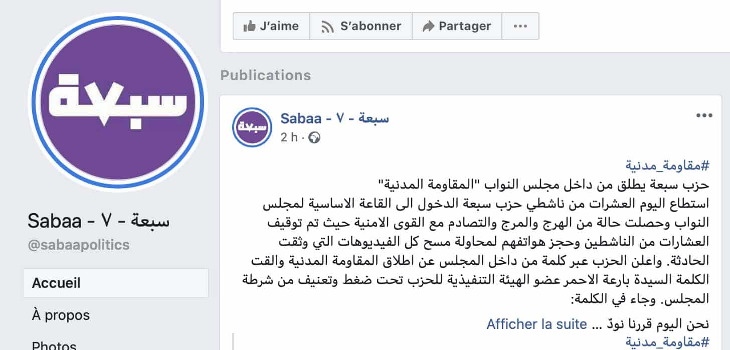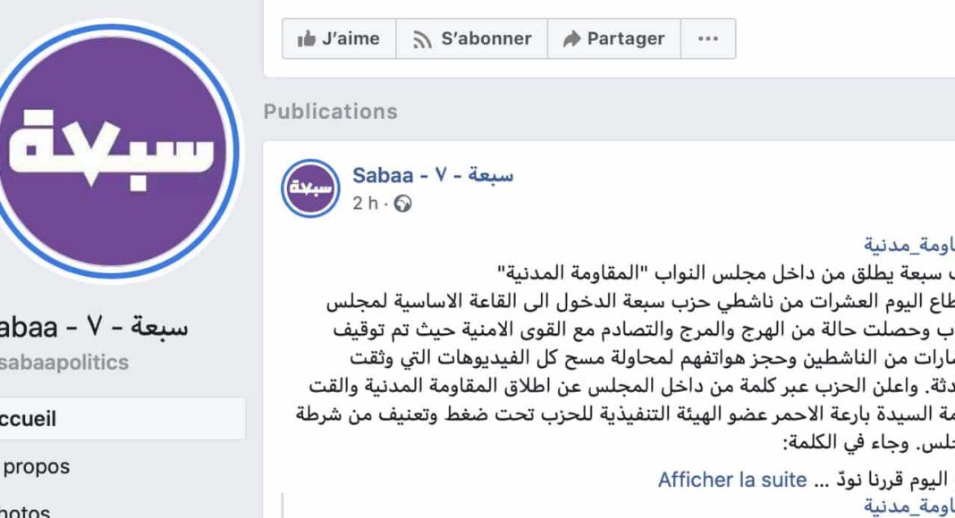 Dans un communiqué publié sur leur page officielle sur Facebook, le parti Sabaa, dont le nom veut dire littéralement sept, a indiqué que quelques dizaines de ses partisans ont réussi aujourd`hui à pénétrer dans l’hémicycle de la Chambre des députés et un tohu-bohu a eu lieu avec les forces de l’ordre qui ont arrêté une dizaine de manifestants et ont confisqué leurs téléphones dans une tentative d’effacer les vidéos qui ont documenté ce qui s’est passé.