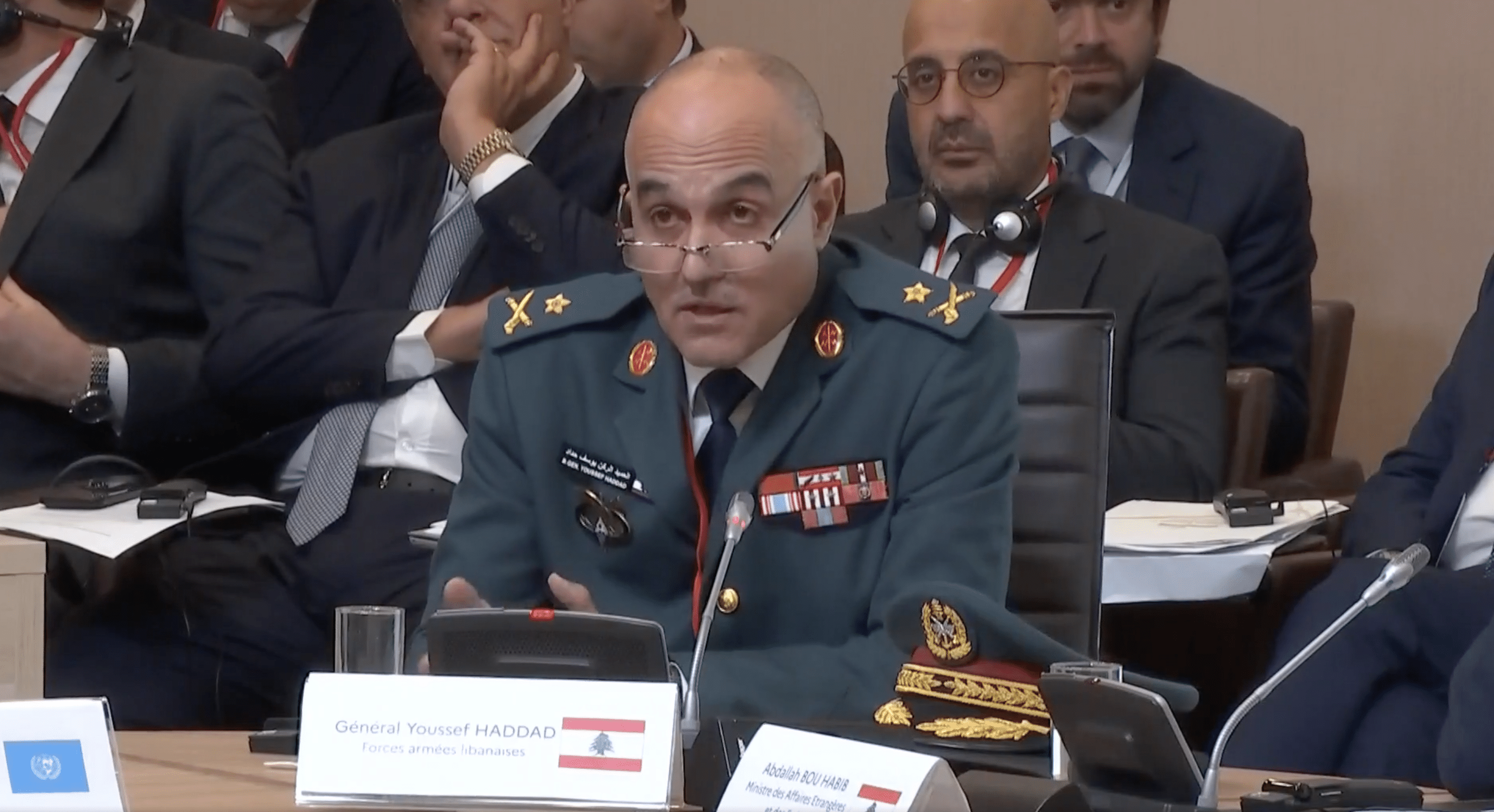 Merci beaucoup, Monsieur le Président. Excellences, Mesdames et Messieurs. Permettez-moi, au nom du commandant en chef de l’armée libanaise, le général Joseph Aoun, qui ne peut être présent aujourd’hui en raison de la situation, de vous remercier tous pour le soutien que vous apportez aux Forces armées libanaises. Et quand je dis Forces armées libanaises, j’inclus également les Forces de sécurité intérieure et toutes les agences de sécurité au niveau de l’État libanais aptes à rétablir la souveraineté de l’État dans le Sud-Liban et plus particulièrement au sud du fleuve Litani.