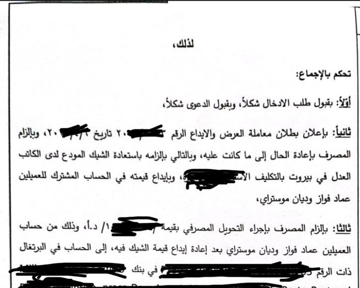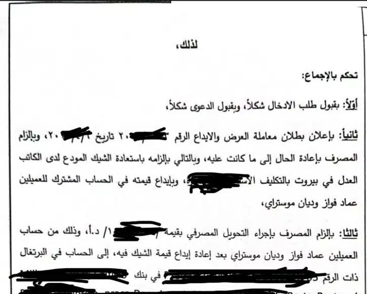 La cour a ordonné à la banque Audi de transférer la valeur de la somme déposée sur un compte bancaire à l’étranger, spécifié par le plaignant. Elle a également refusé de reconnaître que le dépôt du chèque auprès d’un notaire constituait un moyen valable pour remplir les obligations de la banque envers le déposant. - Transfert bancaire obligatoire :