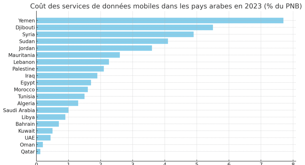 Le Liban se distingue également par ses coûts élevés pour l’accès au broadband mobile. Un forfait mobile pour 2 gigaoctets (GB) de données représente 2,26 % du PNB par habitant, contre 10 % en 2022. Ce coût est néanmoins encore supérieur à la moyenne des pays arabes (2,16 %). À titre de comparaison, le Yémen reste le pays le plus cher pour le broadband mobile avec 7,7 % du PNB, tandis que le Qatar affiche les tarifs les plus bas à seulement 0,12 % du PNB.