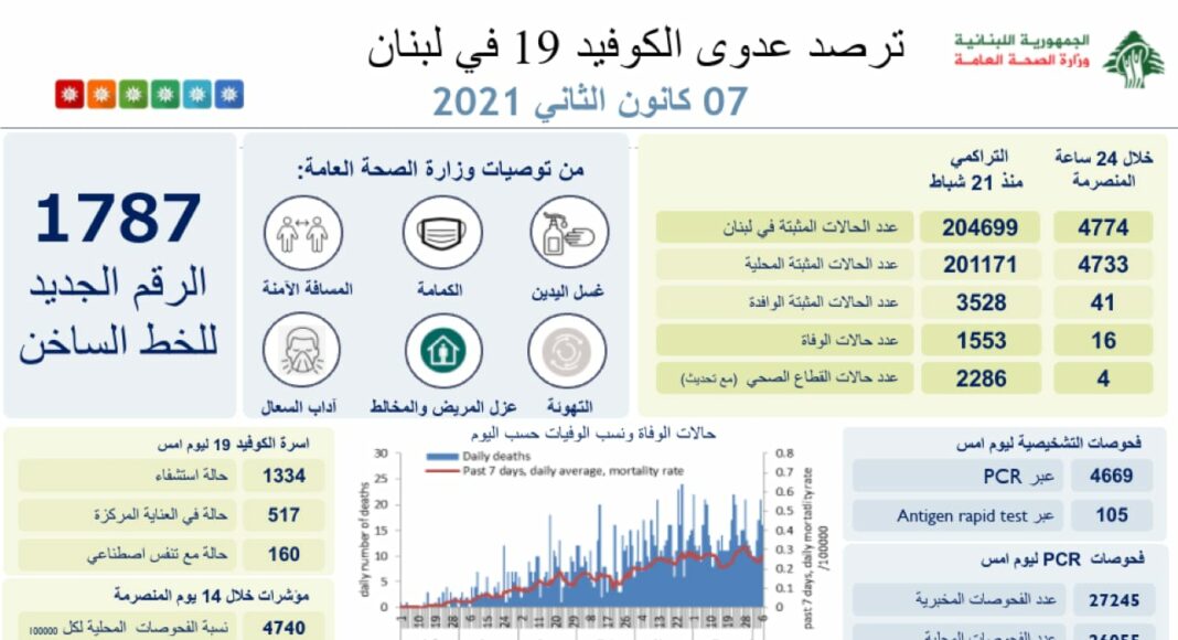 16 décès ont été donc annoncés ces dernières 24 heures. Le nombre total de personnes décédées est de 1 553 depuis l’apparition de la maladie au Liban, le 21 février 2020.