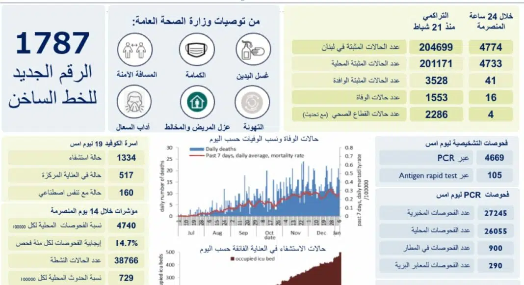 Les autorités libanaises ont annoncé que 4 774 cas de personnes contaminées par le covid19 ont été diagnostiqués au premier jour du confinement qui devrait durer jusqu’au 1er février. Le seuil symbolique des 200 000 cas est ainsi franchi ce jeudi 7 janvier alors que les services hospitaliers sont désormais saturés.