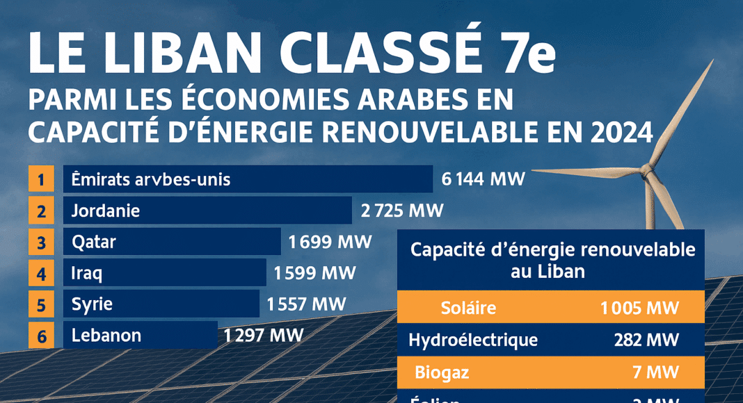En 2024, la capacité totale d’énergie renouvelable dans les pays arabes est estimée à environ 21 250 MW. Le Liban, avec 1 297 MW, pèse pour 6,1 % de cet ensemble.