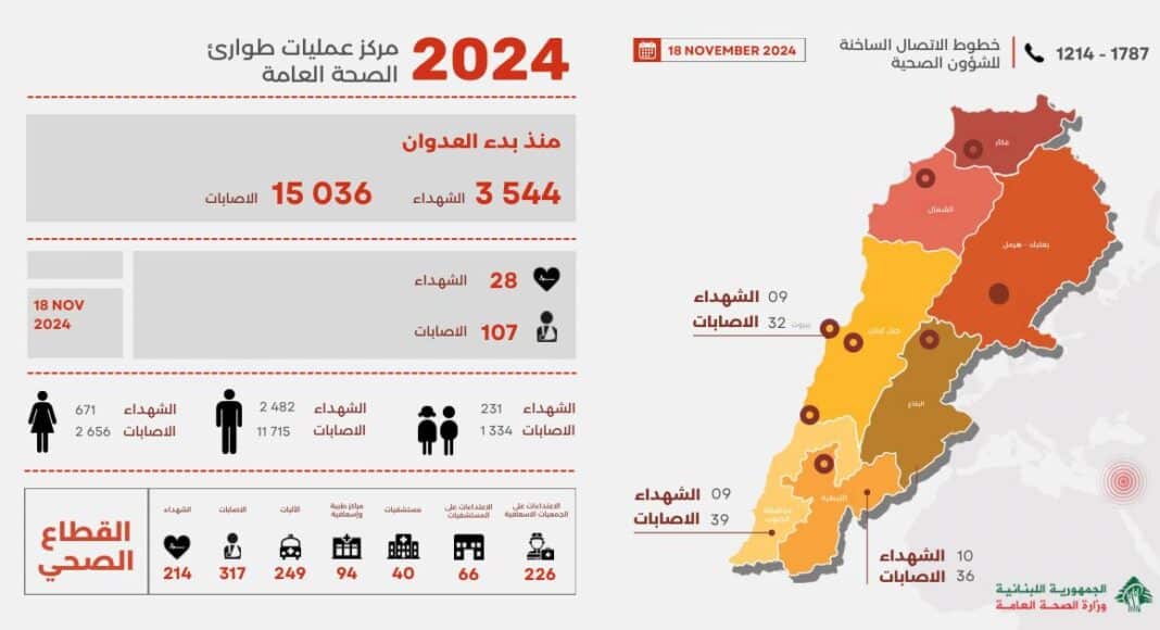 Depuis le début des agressions, le Liban subit un lourd tribut humain, avec un bilan s’élevant à 3 544 morts et 15 036 blessés au 18 novembre 2024. Ces chiffres, rapportés par le Centre des opérations d’urgence du ministère de la Santé publique, témoignent de la violence continue qui frappe le pays, aggravant une crise humanitaire sans précédent.