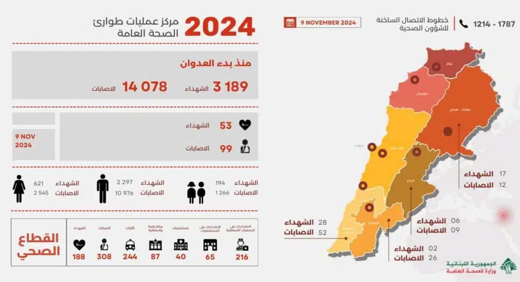Depuis le début du conflit, le Liban subit un lourd tribut humain et matériel, notamment dans le secteur de la santé. Les récentes données publiées par le ministère de la Santé publique libanais, datées du 9 novembre 2024, dressent un tableau sombre des conséquences de cette crise sur la population et les infrastructures de santé à travers le pays.