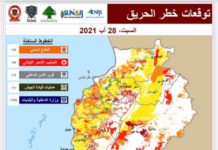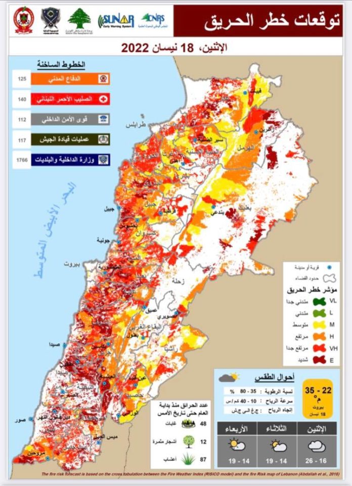 Les risques de voir les forêts s’embraser sont notamment fortes au Sud du Liban et au centre du pays, note la carte, avec des incendies déjà présents au Chouf.