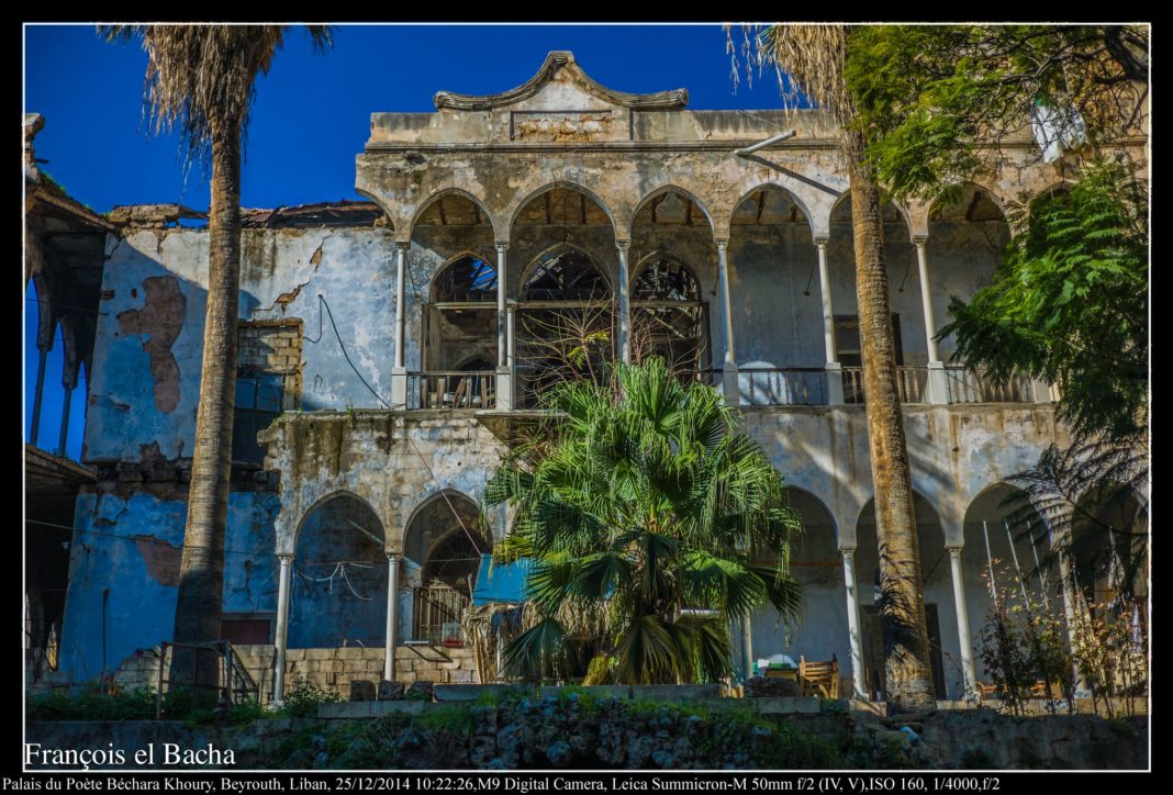 Le Palais du poète Béchara el Khoury, né à Ehmej en 1885 et mort le 31 juillet 1968 – à ne pas confondre avec l’ancien président de la république ou encore le compositeur – aurait été construit aux environs des années 1870, durant la période ottomane de ce qui allait devenir le pays des cèdres. Si certaines sources indiquent qu’il appartiendrait à la famille du poète qui se trouve aujourd’hui à l’étranger, selon d’autres, le bâtiment serait déjà entre les mains de la municipalité de Beyrouth. Il était jusqu’à présent occupé par un charpentier.