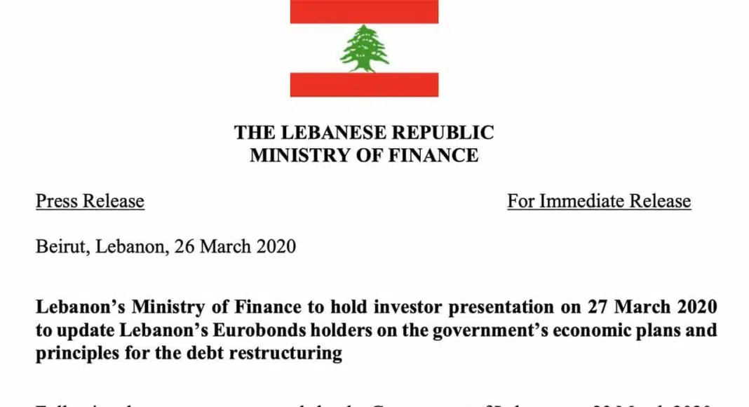 Le ministère des Finances du Liban a indiqué qu’il tiendra une présentation destinées aux créanciers détenant des obligations internationales libanaises, le 27 mars 2020. Il s’agira d’informer les détenteurs libanais des euro-obligations des plans économiques et « des principes du gouvernement » dans le cadre de la restructuration de la dette.