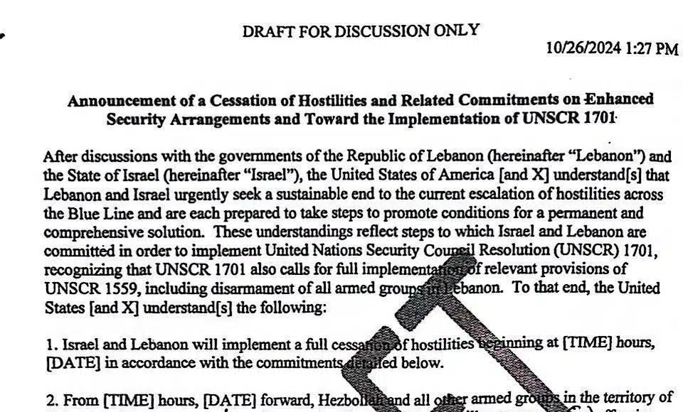 Un projet d’accord circulerait actuellement en faveur d’un cessez-le-feu entre le Liban et Israël. Le document aurait été leaked via des sources israéliennes. il s’inscrit dans un contexte de montée des tensions le long de la ligne bleue entre Israël et le Liban, avec une implication notable du Hezbollah, acteur influent dans la région. La résolution 1701, adoptée en 2006, vise à stabiliser la région en interdisant toute présence armée autre que celle de l’État libanais au sud du fleuve Litani et en renforçant le mandat de la Force intérimaire des Nations unies au Liban (FINUL).