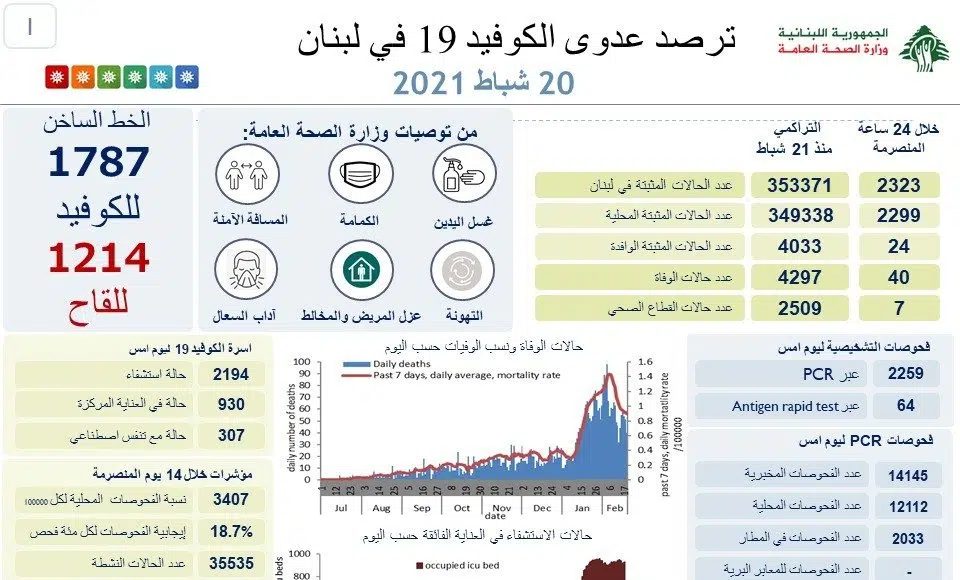 Lebanon deplores 40 new deaths of people infected with COVID19 and 2,323 new cases, while a second batch of 31,500 doses of Pfizer-type vaccine was sent on Saturday, February 20, 2021.