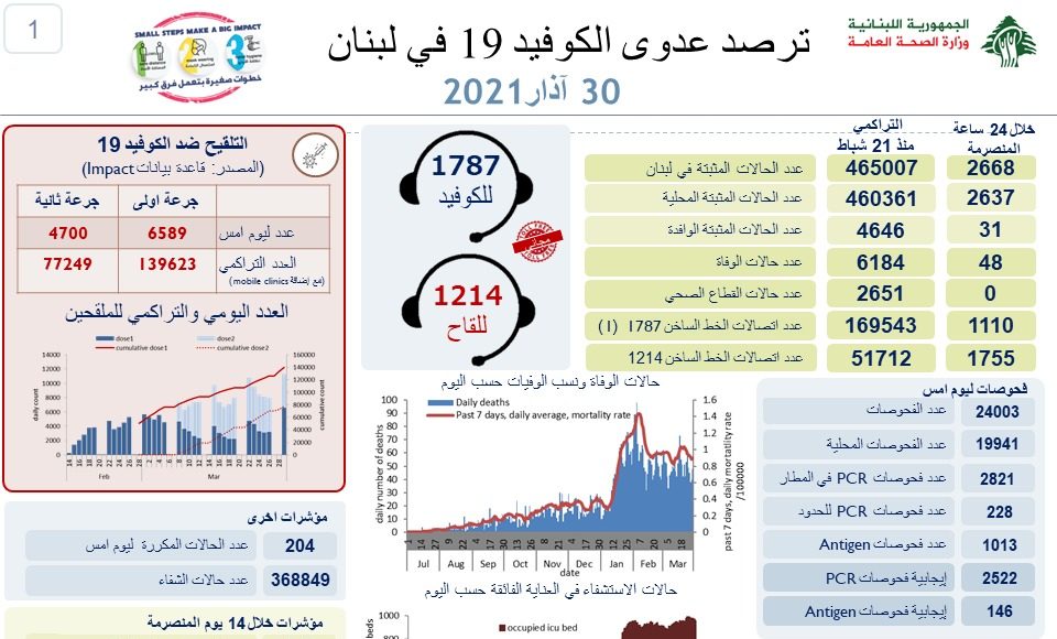Au total, 465 007 ont été contaminées depuis le 21 février 2020, date de la découverte d’un premier cas au Liban.
