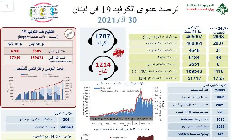 48 décès ont été donc annoncés ces dernières 24 heures. Le nombre total de personnes décédées est de 6 184 depuis l’apparition de la maladie au Liban, le 21 février 2020.