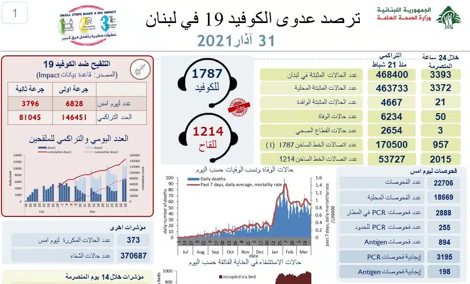 Au total, 468 400 ont été contaminées depuis le 21 février 2020, date de la découverte d’un premier cas au Liban.