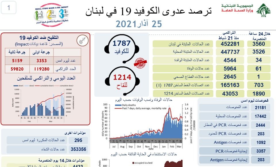 The Lebanese authorities deplore 61 deaths on Thursday (March 25th). 3,560 people have also been diagnosed positive in the past 24 hours, while outgoing Finance Minister Ghazi Wazni has announced the release of credit lines needed to purchase 1.5 million doses of AstraZeneca vaccine.