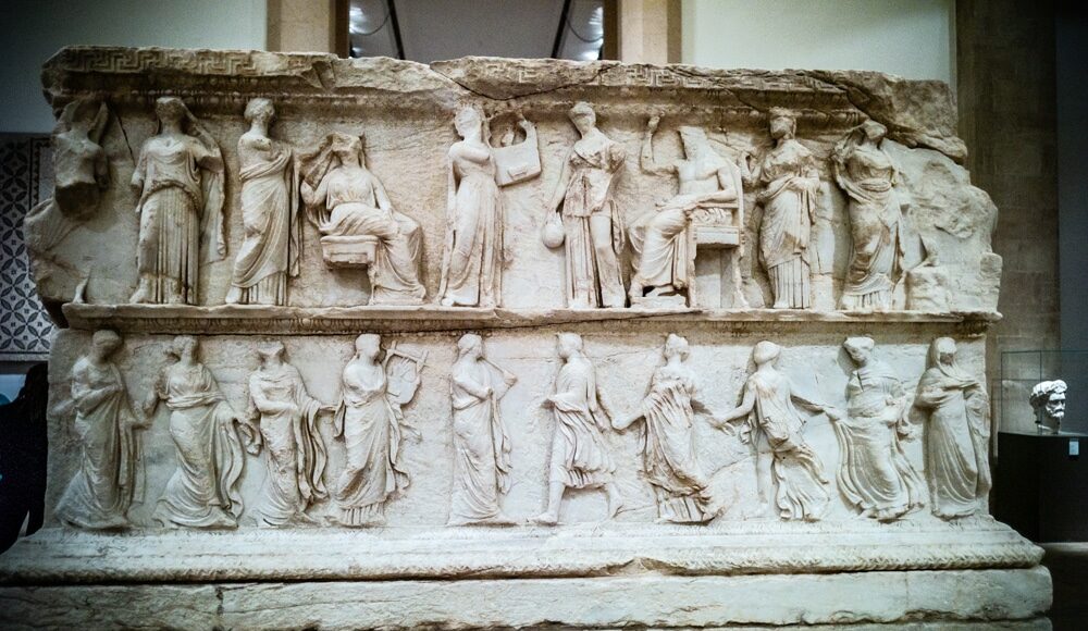 The Greek gods appear on the many bas-reliefs on each side. The figures seem to have been vandalized on the faces in particular.