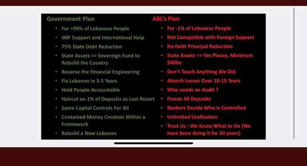 D’après certaines sources, un autre plan alternatif (en date du 16 juin 2020 mais présenté le 17 juillet 2020) imaginé par la Levant Investment Bank (Libank) et l’ancien banquier Nicolas Chikhani serait au cœur des discussions en coulisses pour rapprocher le plan du gouvernement et celui de l’ABL. Ce plan, bien qu’intéressant et intelligent, prévoit un contrat de bail (« lease ») entre la BDL et les banques pour les réserves d’or…