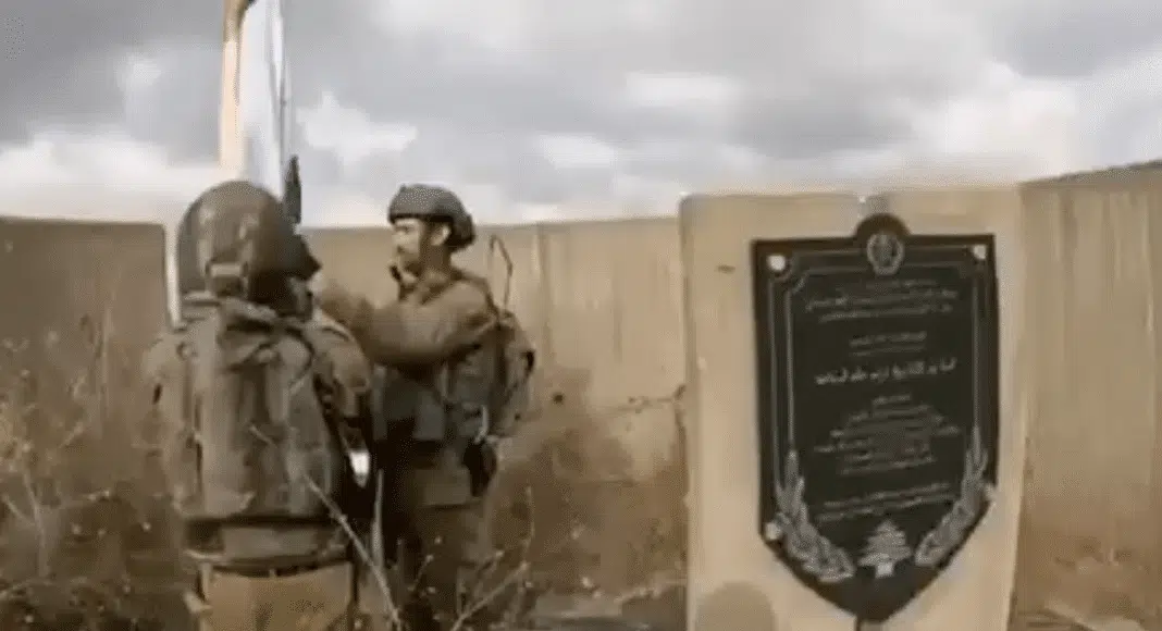On y voit des soldats israéliens hisser un drapeau de leur pays sur un m^tt avec à côté une plaque de l’armée libanaise.